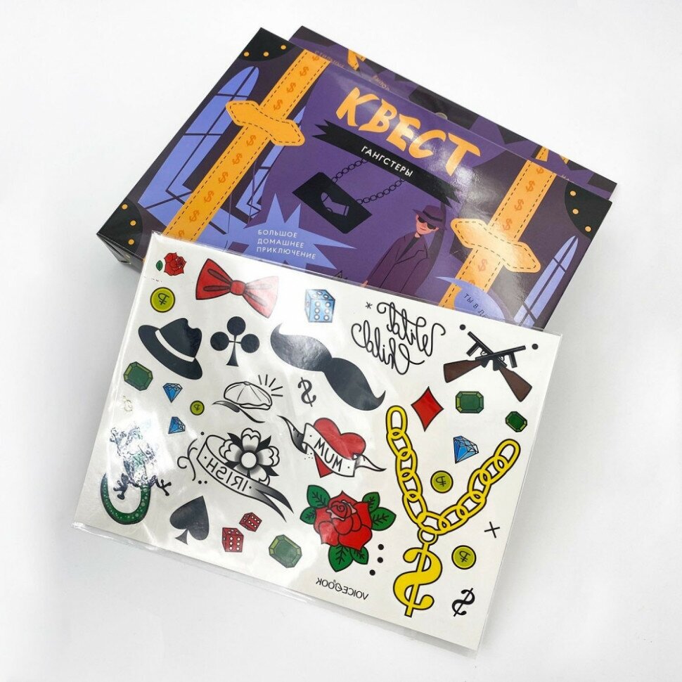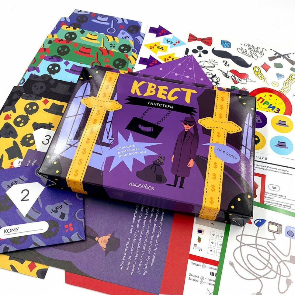 Квест-игра VoiceBook . Представляем Вашему вниманию игру настольная VoiceBook Квест . Не такто просто вступить в банду Железных носков – для этого вам придется пройти ряд испытаний и даже ограбить банк подарков! Планируйте маршрут, избегая полицейских застав, тренируйте внимательность и смекалку, чтобы взломать сейф, и наколите себе татуировку настоящего гангстера!В большой квест «» вошли: 7 конвертов с заданиями; 3 дополнительные карточки заданий; заготовка для оригами; набор наклеек для запечатывания конвертов и навигации; тематические tattooпереводилки; подробная инструкция для родителей.Квест рассчитан на детей 7–12 лет и проходится по следующему маршруту: кровать → чайник → кастрюля → куртка → шкаф → стиральная машина → холодильник→ приз