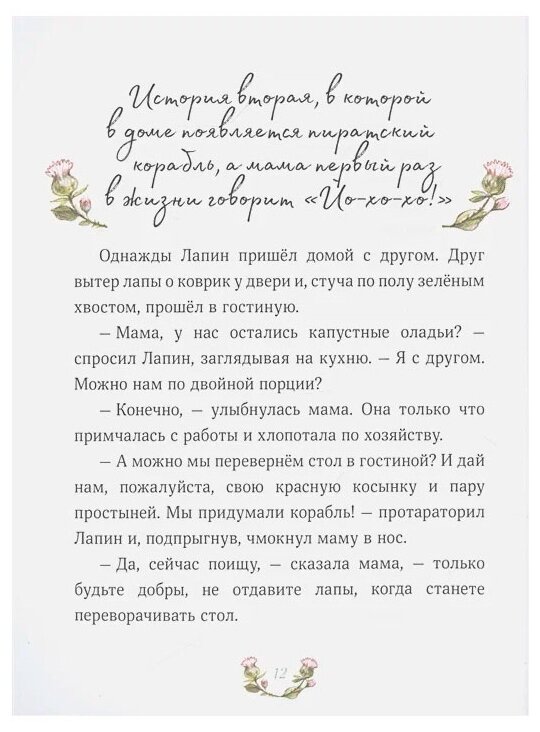 Уютная книга про маленького кролика с чудесными иллюстрациями, стихами и рецептами. Лапин — маленький кролик, которому не сидится на месте. Он должен научить хомяка слушать, как в ушах свистит ветер, покормить подкроватное чудовище морковными пастилками и срочно что-то изобрести. Папа Лапин пишет стихи, а мама знает, где найти радость. А еще у Лапина есть дядюшка-фокусник и Простодедушка-путешественник (кстати, он его сам нашел). Лапина невозможно не любить, ведь он совершенно такой же, как и любой ребенок. В этой книге вы найдете не только 12 историй про Лапина с волшебными иллюстрациями Маши Судовых, но еще и прекрасные стихи, два рецепта и инструкцию, как сделать фонарик. От автора Когда-то мне улыбнулся кролик, нарисованный на детской маечке. Я стараюсь не забывать о таких удивительных событиях и приберегаю их для книжек. Тогда еще неизвестно было ни об имени кролика, ни о приключениях, ни о том, что он любит и как вообще попал на маечку. Но настало время, когда мы поговорили, я услышала историю Лапина и тут же ее записала. Главный герой остался доволен, а больше всего его порадует, если тебе будет интересно перепрыгивать с одной книжной страницы на другую. Так ведь делают все маленькие кролики? Для кого эта книга Для детей от 3 лет. Цитаты из книги Приятно познакомиться! Вы всегда узнаете меня по клетчатым штанам. Да, я ношу только их. И дело не в том, что мама купила однажды огромный рулон материи в клетку, чтобы сшить шатер для цирка-шапито. Нет! Просто клетчатые штаны с большими карманами — очень удобная вещь. Заведите себе такие, и сами убедитесь. О чем я думаю Мысли у меня разные. Например, мечты. Иногда желания совсем простые: какие-нибудь ватрушки или папино разрешение посидеть в наушниках за его радиостанцией. А бывают и другие мечты. Такие огромные, что я удивляюсь, как они помещаются в моей голове. Где найти радость — Сегодня у всех куда-то подевалась радость. Совершенно необходимо ее вернуть! — Нужно нарядить дерево радости. Всегда помогает, — сказала мама. И удивилась своей находчивости. — Мама абсолютно права. Конечно, дерево радости! — согласился папа. А мама подумала: «Какое счастье, что он не разбил коленки и не подавился вишневой косточкой. А уж радость как-нибудь найдем». Любимое занятие Лапин очень любил бегать. Наперегонки с папой, за бабочкой и просто так. Там и тут на лугу, среди люпинов и пижмы, мелькали его клетчатые штаны. Особенно ему нравилось слушать, как ветер свистит в ушах. Уши летели вслед за Лапином, а он бежал и думал: «Нет, без таких замечательно длинных ушей бегать было бы гораздо хуже!» Эксперименты Лапину некогда было скучать. Каждый день находилось столько интересных занятий, что маленький кролик переживал, как бы все успеть. Больше всего Лапину нравилось ставить эксперименты. «Что будет, если пустить папин зонт вниз по ручью?» — думал Лапин. И уже через неско.