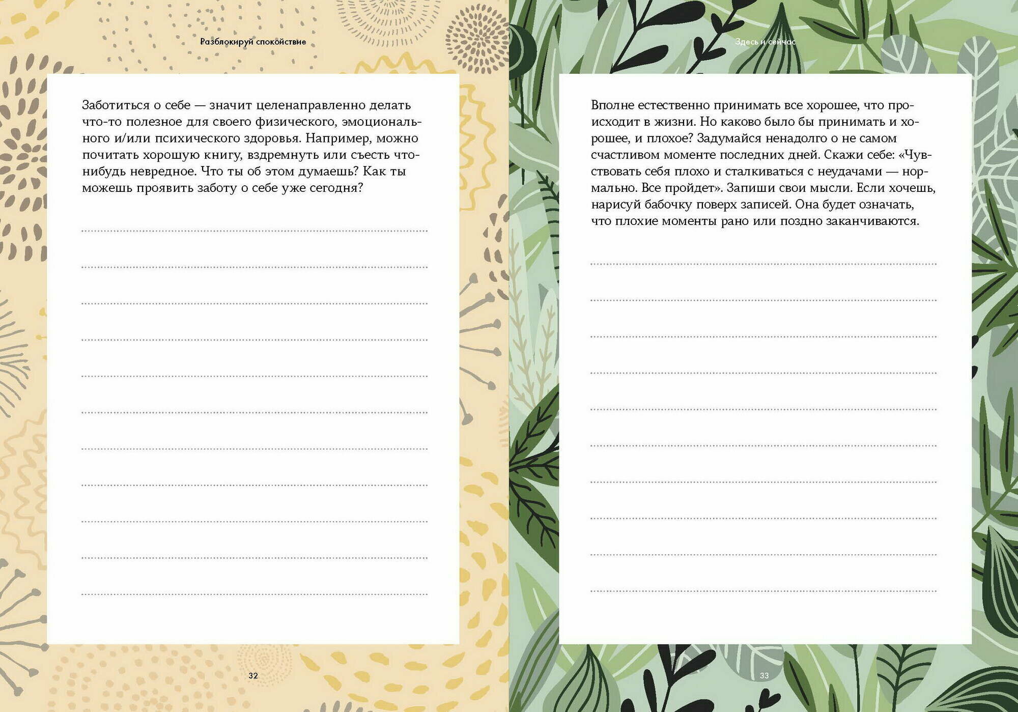 В этой книге/тетради чередуются практики/рекомендации по осознанию и управлению своих чувств и мыслей со страницами для обдумывания. Это страницы, на которых описывается ситуация или задается вопрос, на который ниже нужно написать ответ. Это всегда вопрос из твоего сознания и чтобы написать ответ надо основательно там порыться.