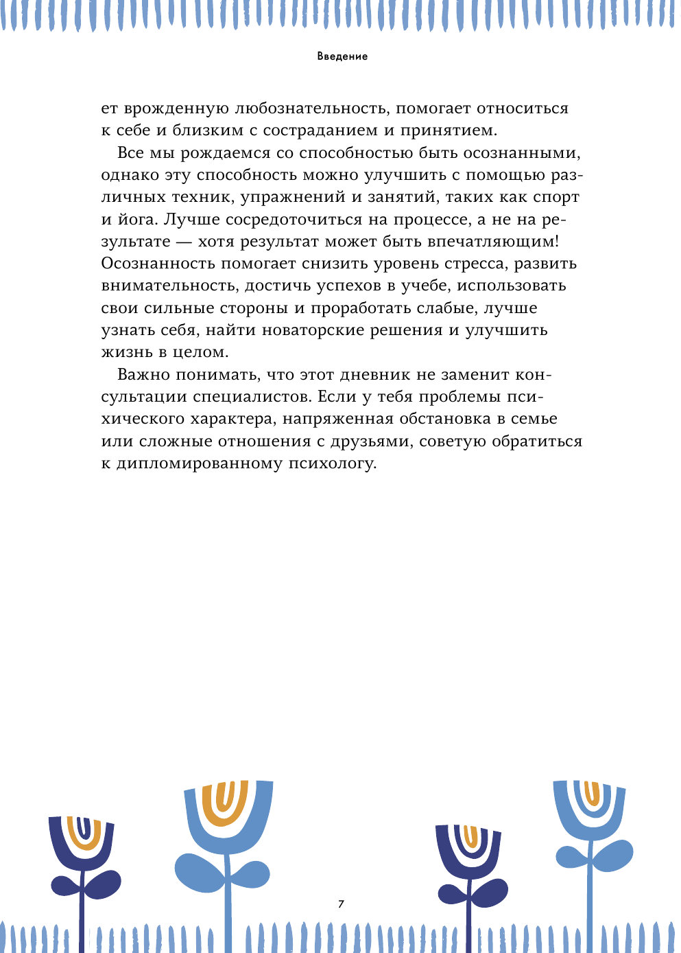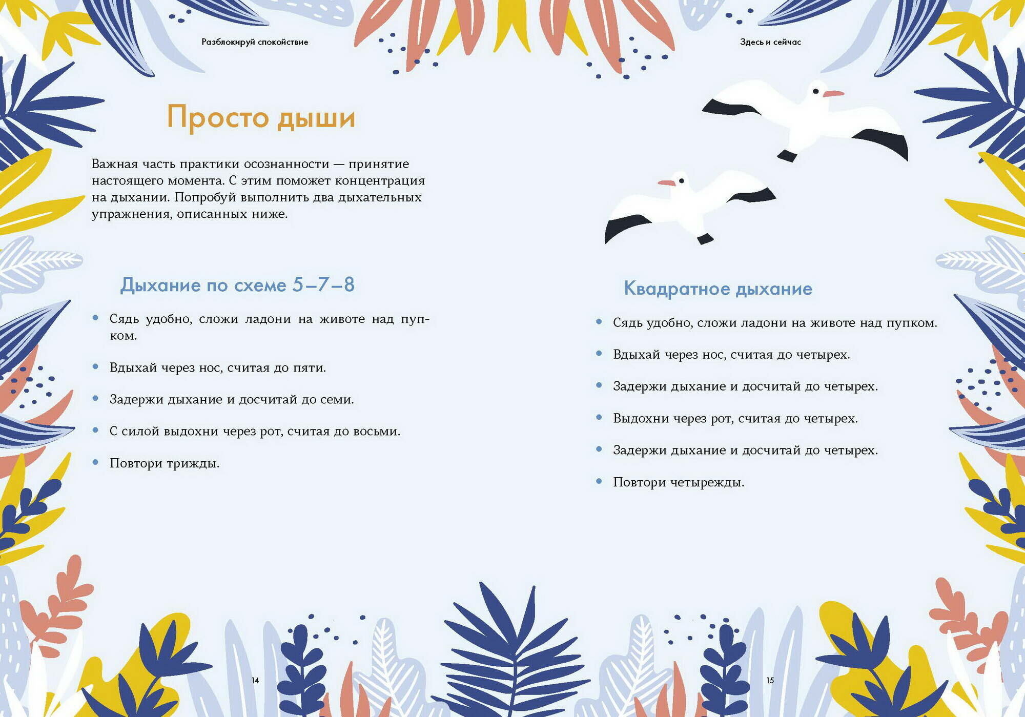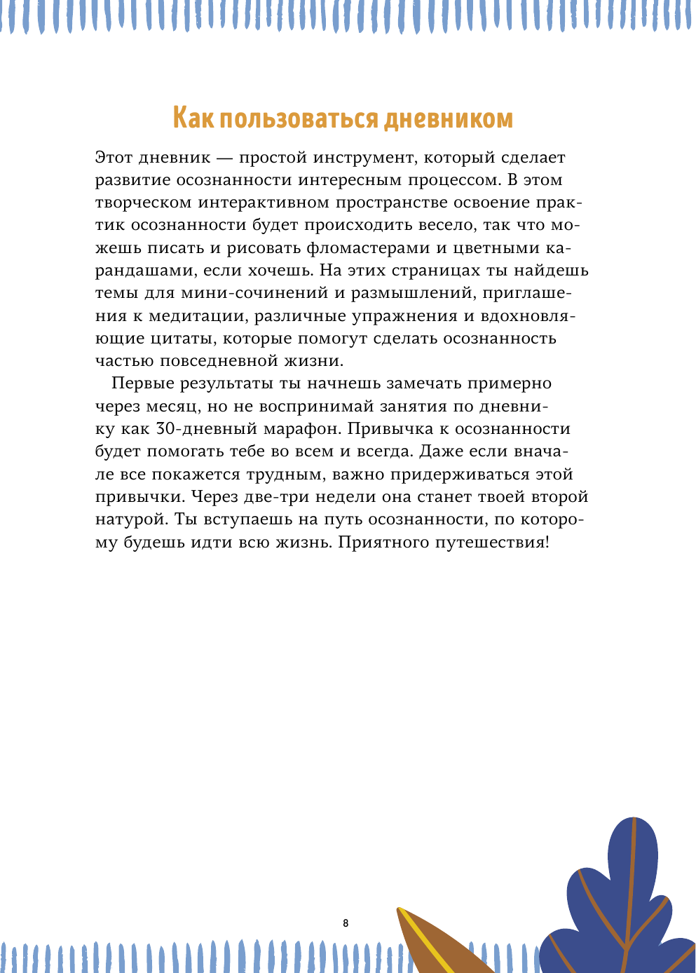 С этого дневника хорошо начинать свой путь самопознания. Тут самые простые и распространенные практики: дыхание по схеме 5-7-8, квадратное дыхание, «поза силы», «вкусное» упражнение, сканирование тела, осознанная прогулка, метод «А, Б, В», медитации. Понятные вопросы, которые позволят заглянуть вглубь себя и просто очень симпатичное оформление. Издание приятно держать, листать, рассматривать и вести записи. А еще это отличный подарок!