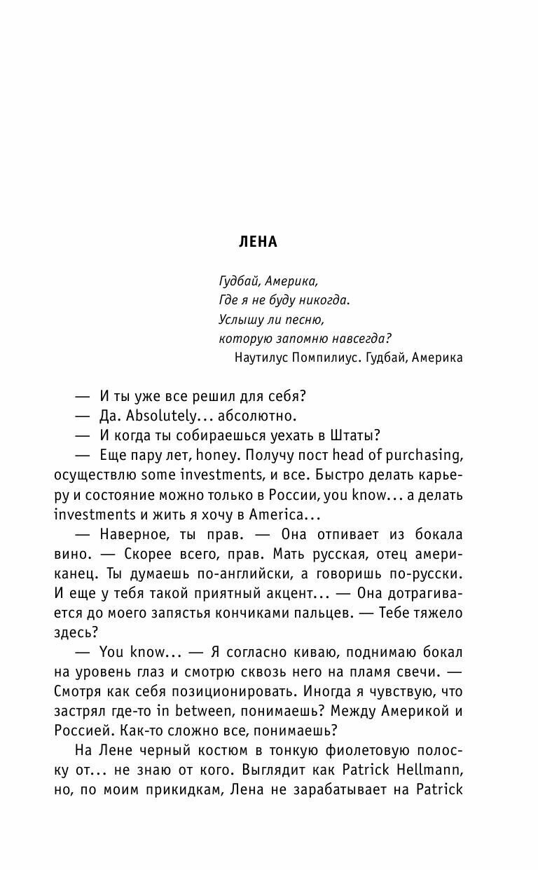 Квартира, новый клуб, очередной ресторан - типичные с места пребывания Андрея, где он встречает новых или старых знакомых. Оценочные суждения об окружающих его людях основанные на внешнем виде с изобилием в описании различных брендов, наверное, помогают больше окунуться в среду его обитания, но для не посвящённого в эту жизнь человека, как я, всё эти слова в одно ухо влетают, в другое вылетают.