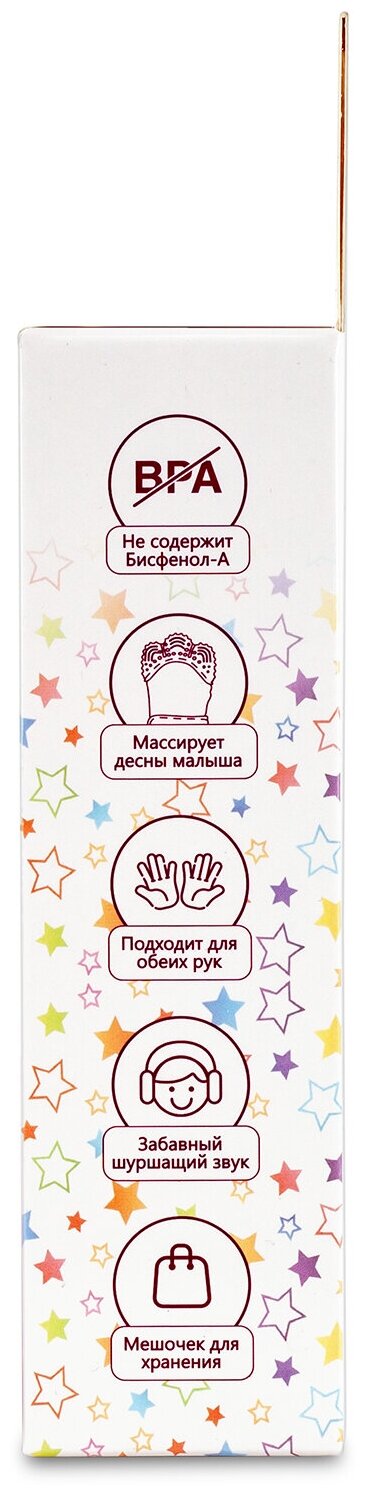 Рукавичка прорезыватель NDCG от 3х до 12 месяцев. Cиликоновые прорезыватели варежка - это идеальная игрушка для малышей от 3х месяцев. Он эффективно массирует десны малыша и облегчает процесс прорезывания зубов. Его шуршащий звук привлечет внимание вашего малыша и развлечёт его. Вы легко можете зафиксировать рукавичку на запястье малыша используя мягкую застежку-липучку. Откройте застежку внизу и просуньте руку малыша. Рукавичку можно надевать на обе руки. Благодаря надежной фиксации рукавички малыш не выронит её. В комплект входит сам прорезыватель и мешочек для прорезывателя, который позволит легко взять его с собой в дорогу. Прорезыватель перчатка, грызунок для новорожденных, прорезыватель для зубов, погремушка прорезыватель, - детские прорезыватели для самых маленьких с широким выбором цвета. Прорезыватель-перчатка и варежка грызунок - это удобные решения, позволяющие маме и папе выполнять все свои дела, а малышу одновременно развиваться и успокаиваться. Наши силиконовые прорезыватели изготовлены из безопасных материалов и специально разработаны для успокоения боли в период прорезывания зубов. Игрушка прорезыватель - это не только полезный аксессуар, но и интересное развлечение для вашего малыша. Материал: безопасный пищевой силикон, мягкая тканая часть, позволяющая коже дышать. Не содержит Бисфенол-А, ПВХ,фталатов, латакса и свинца. Прорезыватель размер: 9,5х7х2 см.