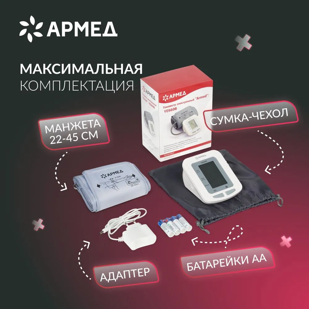 Высокотехнологичный автоматический тонометр Армед YE-660B голосовой на плечо - незаменимый помощник в контроле вашего здоровья. С его помощью вы сможете точно и быстро измерить артериальное давление и пульс, не выходя из дома. Благодаря уникальным функциям и качественной сборке, этот медицинский электронный прибор обеспечит надежные результаты измерений.