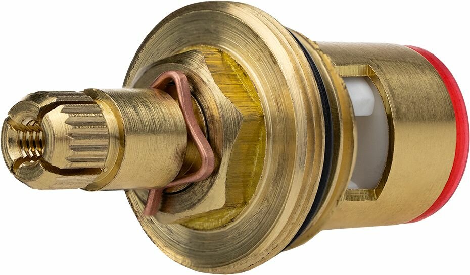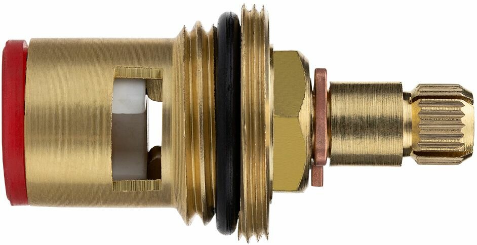Кран-букса керамическая с дополнительной резьбой. Используется для двуручковых (с двумя маховиками) смесителей. Внутренний запорный элемент в данной кран-буксе выполнен из керамических отполированных дисков (пластин) с отверстиями (статичного и поворотного), совмещение или развод которых обеспечивает работу смесителя.