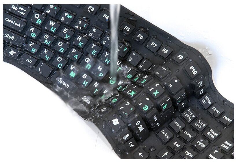 Влагозащищенная клавиатура, IP 54. Опускать полностью в воду не стоит. Для чистки клавиатуры достаточно протереть ее мокрой ветошью, губкой. Для слепого набора текста не подходит, необходима некоторая фиксация кнопок. Для небольшой, посредственной работы за ПЭВМ.
