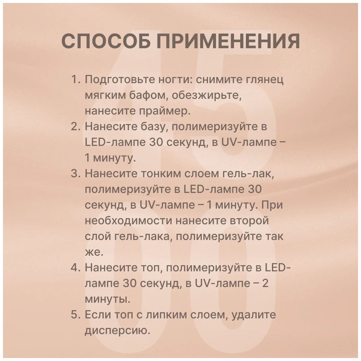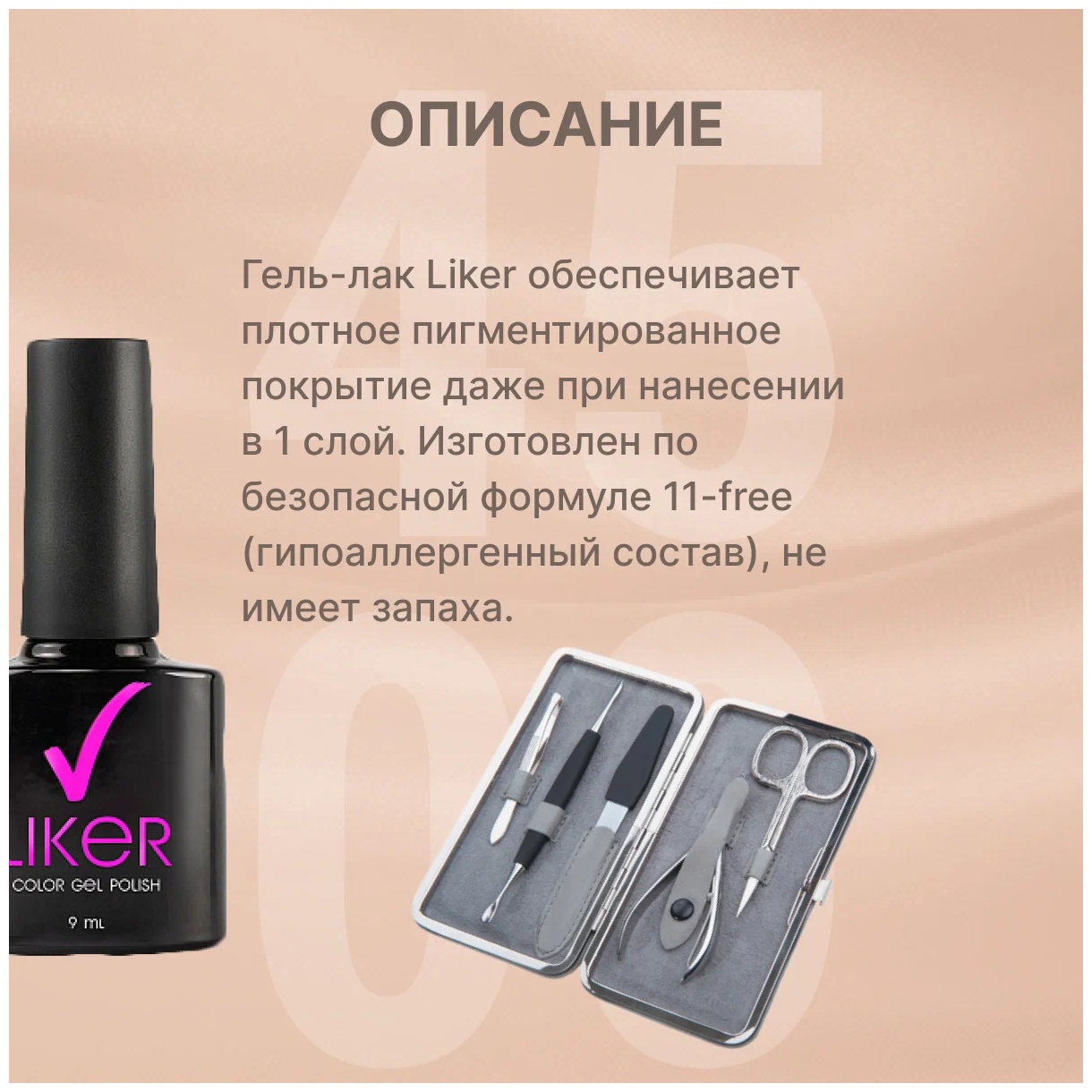 LIKER – это гель-лаковое покрытие нового поколения для тех, кто не стоит на месте, постоянно пробует новое и движется вперед без сомнений! Идеально сбалансированная формула обеспечивает плотную консистенцию, эффект самовыравнивания, высокую пигментацию, насыщенные цвета, невероятную стойкость и яркий блеск. Легкое нанесение даже в 1 слой и стойкость маникюра до 4 недель без сколов и царапин, при минимальной стоимости покрытия позволяет экономить усилия и время мастера, а также постоянно баловать себя и своих клиентов новыми оттенками! Средства изготовлены по безопасной формуле 11-free, не имеют запаха.