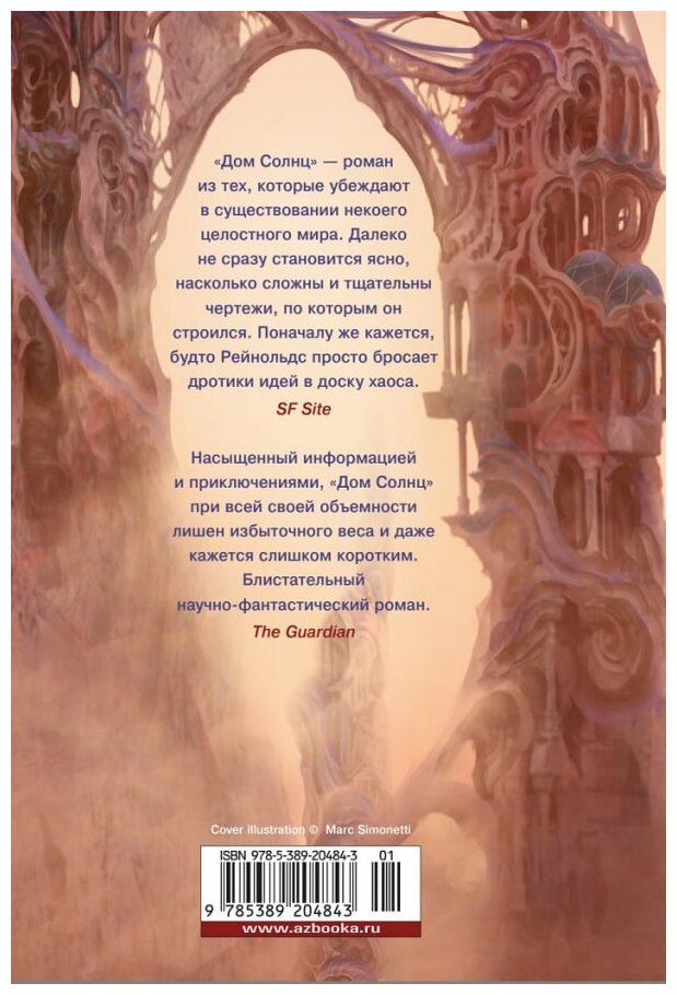 Наконец издательство переиздало этот роман, до этого первое издание было не много не того размера как вся серия. Кто читал цикл, то не стоит здесь ожидать чего-то сверхъестественного. Как совет, не начинайте знакомство с этим автором с романа «Дом солнц», а то посчитаете его довольно-таки средненьким и не будете открывать Рейнольдса дальше.