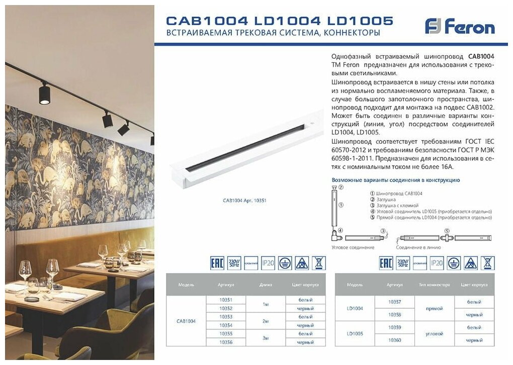 Однофазный встраиваемый шинопровод ''Feron'' предназначен для использования с трековыми светильниками. Шинопровод встраивается в нишу стены или потолка из нормально воспламеняемого материала. Может быть соединен в различные варианты конструкций (линия, угол) посредством соединителей.