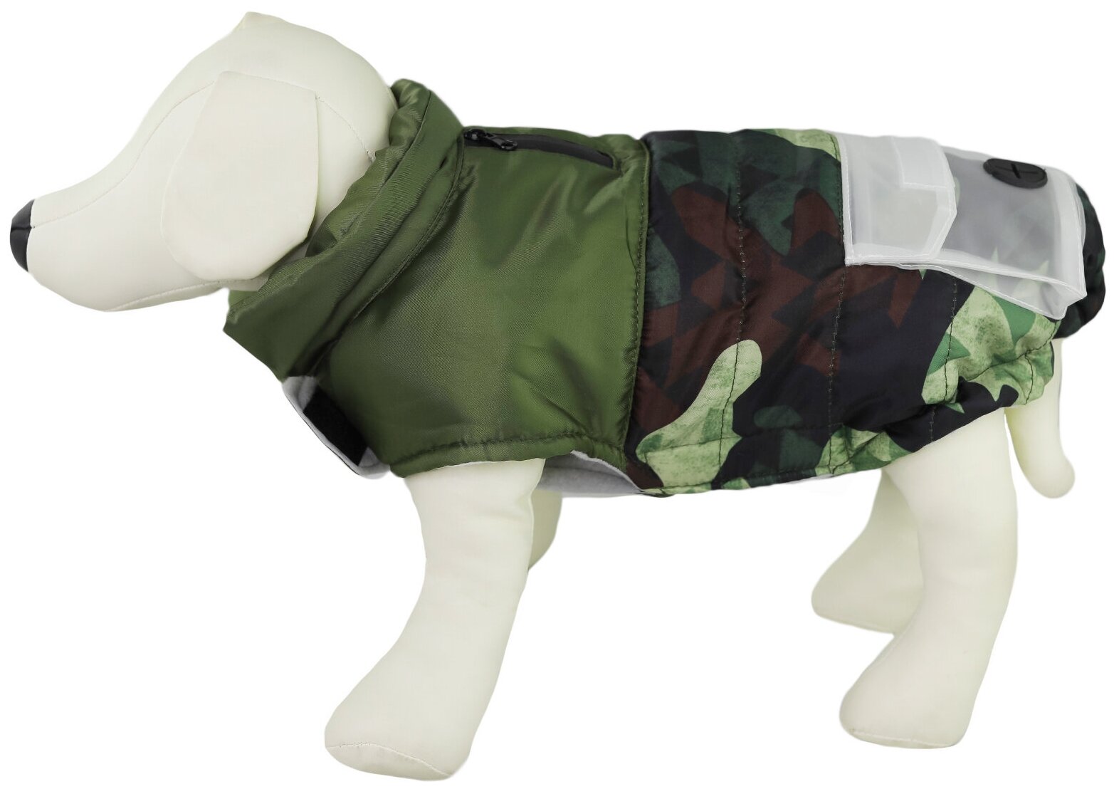 Теплая жилетка, попона, одежда для животных, для собак в стиле милитари с подкладом из флиса. С удлиненным воротником, защищающим от ветра. Крепления - липучки. В жилетке прошита молния, которую можно расстегнуть для пристегивания шлейки к ошейнику питомца. С внешней стороны на спинке прикреплен специальный кармашек для мелких вещей. Размер изделия - S. Обхват шеи - 32 см, обхват груди - 40 см, длина спинки - 30 см.