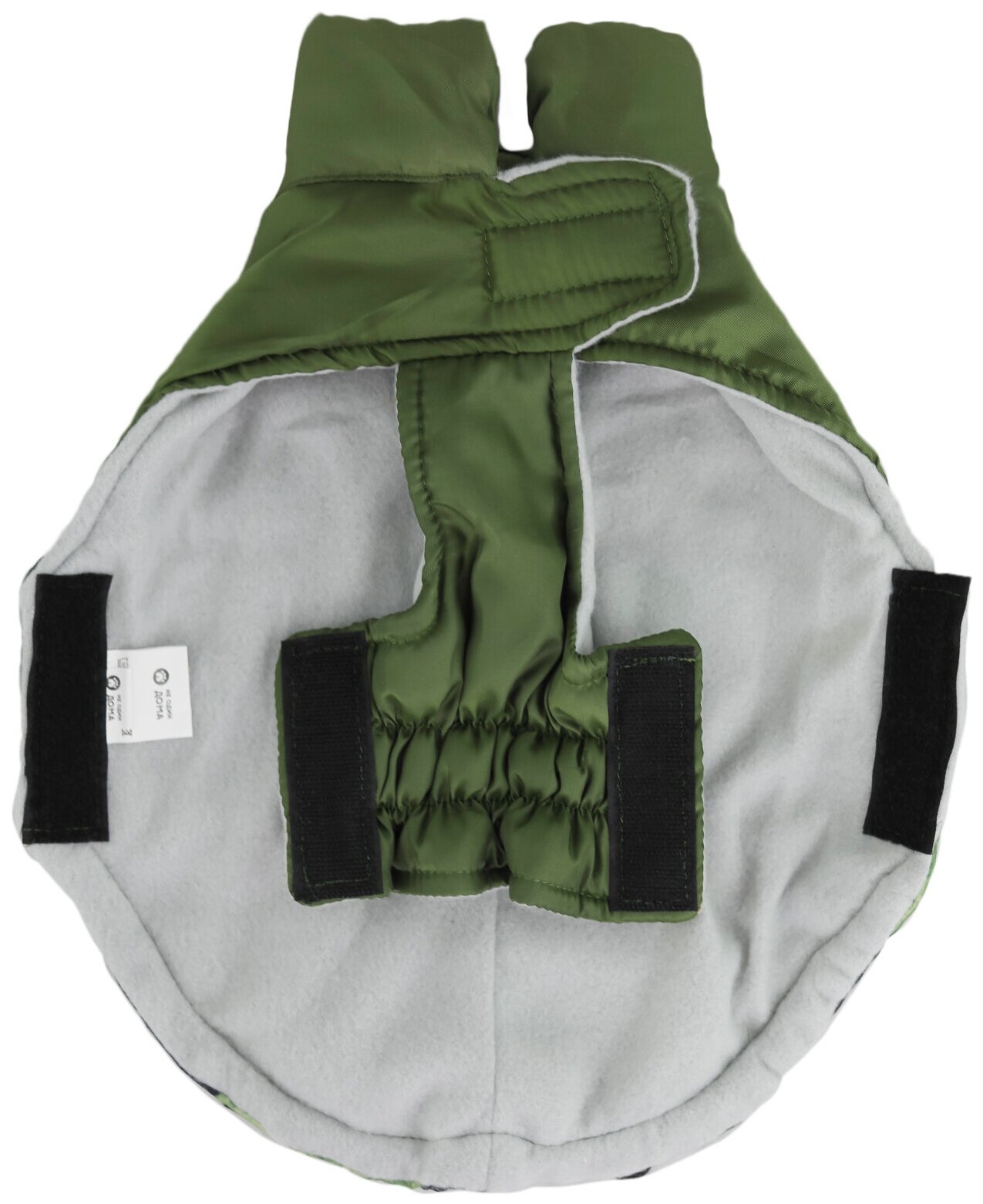 Теплая жилетка, попона, одежда для животных, для собак в стиле милитари с подкладом из флиса. С удлиненным воротником, защищающим от ветра. Крепления - липучки. В жилетке прошита молния, которую можно расстегнуть для пристегивания шлейки к ошейнику питомца. С внешней стороны на спинке прикреплен специальный кармашек для мелких вещей. Размер изделия - XL. Обхват шеи - 40 см, обхват груди - 56 см, длина спинки - 45 см.