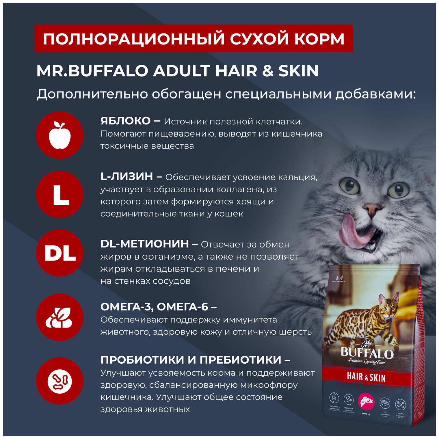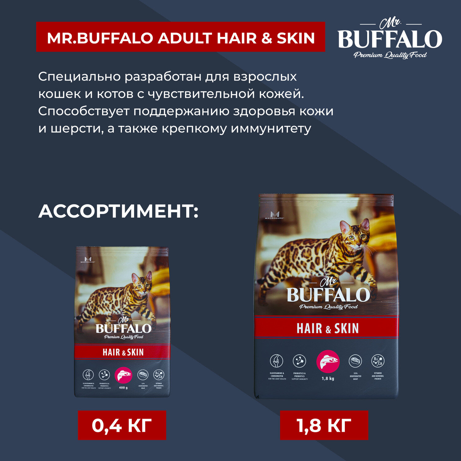 Одним из ключевых компонентов корма Mr.Buffalo является уникальное запатентованное вещество MacroGard (МакроГард), которое является натуральным иммуностимулятором. Он активизирует естественные функции организма кошек и собак, помогает им бороться с инфекциями, поддерживает здоровое пищеварение, повышает сопротивляемость организма к бактериям, вирусам, грибкам и понижает риск различных заболеваний.