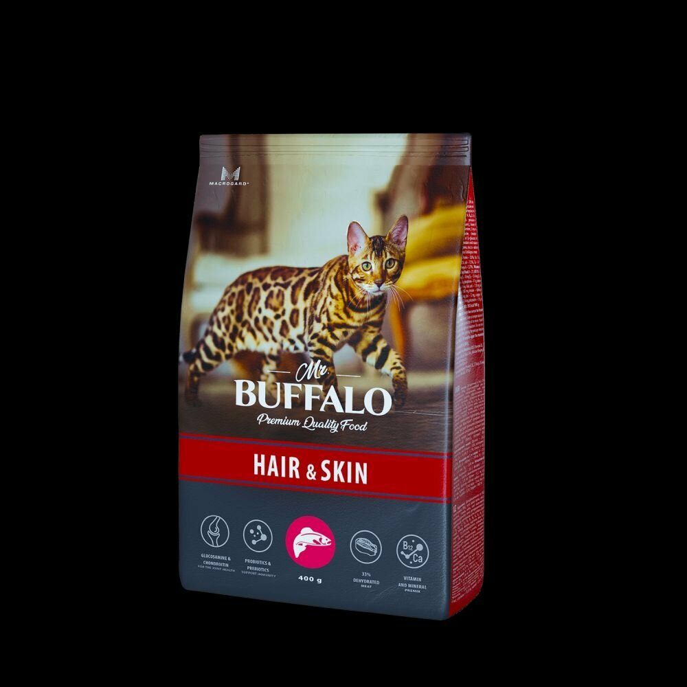 Полнорационный сухой корм Mr.Buffalo HAIR & SKIN с лососем для взрослых кошек и котов с чувствительной кожей. Содержит высококачественные ингредиенты и все необходимые питательные вещества, включая витамины группы В, витамин Е, цинк, клетчатку. За счет сбалансированного содержания Омега-3- и Омега-6 жирных кислот, эффективность которых доказана клиническими испытаниями, корм способствует поддержанию здоровья кожи и шерсти, а также крепкому иммунитету.