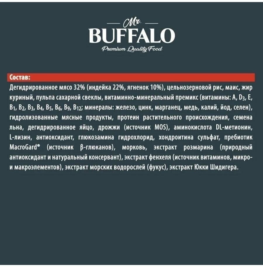 Одним из ключевых компонентов корма Mr.Buffalo является уникальное запатентованное вещество MacroGard (МакроГард), которое является натуральным иммуностимулятором. Он активизирует естественные функции организма кошек и собак, помогает им бороться с инфекциями, поддерживает здоровое пищеварение, повышает сопротивляемость организма к бактериям, вирусам, грибкам и понижает риск различных заболеваний.