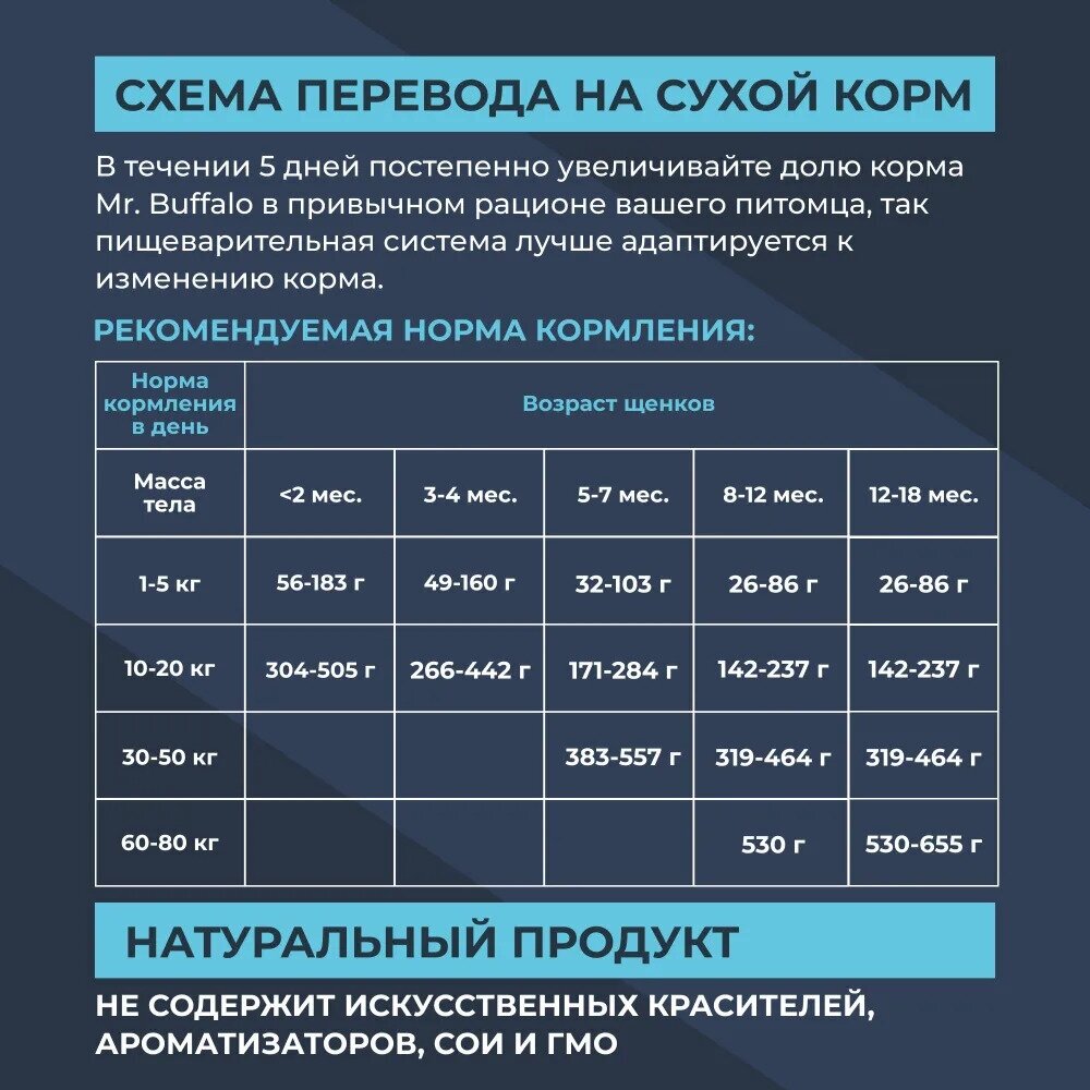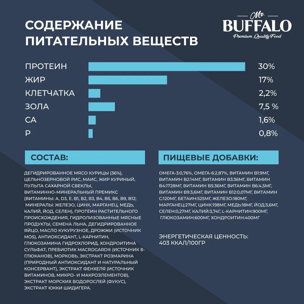 Полнорационный сухой корм Mr.Buffalo PUPPY & JUNIOR с курицей для щенков и юниоров средних и крупных пород. Сбалансированный рацион содержит необходимое количество белков и жиров, что обеспечивает равномерный рост щенка, тем самым снижая нагрузку на опорно-двигательный аппарат. Входящая в состав уникальная добавка MacroGard способствует формированию и поддержке иммунной системы щенка. Рецепт приготовлен из качественных ингредиентов, не содержит глютена или любого другого вещества, которое может нанести вред здоровью вашего любимца.