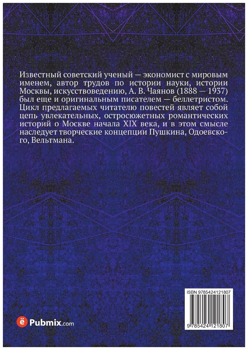 Известный советский ученый - экономист с мировым именем, автор трудов по истории науки, истории Москвы, искусствоведению, А. В. Чаянов (1888 - 1937) был еще и оригинальным писателем - беллетристом. Цикл предлагаемых читателю повестей являет собой цепь увлекательных, остросюжетных романтических историй о Москве начала XIX века, и в этом смысле наследует творческие концепции Пушкина, Одоевского, Вельтмана.