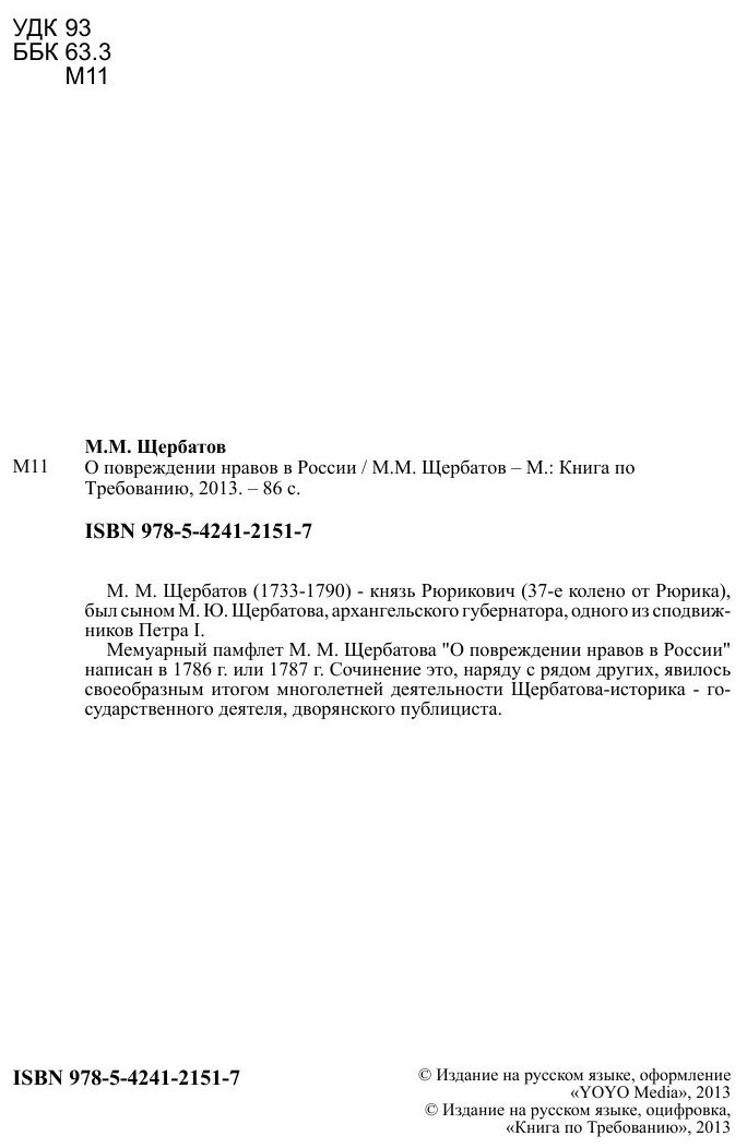 О повреждении нравов в России (Щербатов Михаил Михайлович); RUGRAM, 2013