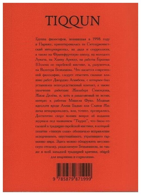 Тиккун — группа философов, возникшая 1998 году в Париже. Она ориентировалась на Ситуационистский интернационал, на дада и сюрреализм, а также на Франкфуртскую школу, на молодого Лукача, на Ханну Арендт, на работы Гершома Шолема по еврейской мистике, и, разумеется, на Вальтера Беньямина. Что касается современной философии, следует отметить сильное влияние работ Джорджо Агамбена, с которым был установлен непосредственный контакт, а также увлечение работами Жильбера Симондона, Жиля Делёза, и, хоть и разделяемы не всеми, интерес к работам Мишеля Фуко. Модные идеологи вроде Алена Бадью или Славоя Жижека игнорировались, или, точнее, презирались. Достаточно скоро возник вопрос об издании журнала под названием «Tiqqun», что было отсылкой к традиции еврейской мистики, в которой понятие «тиккун олам» обозначало исправление испорченного, опустошенного, утратившего гармонию мира. Здесь можно обнаружить мессианскую отсылку, разделяемую Беньямином, но также и всей западной традицией критики, общей для анархизма и социализма.