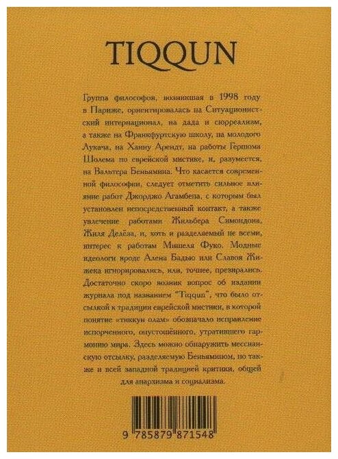 Тиккун — группа философов, возникшая 1998 году в Париже. Она ориентировалась на Ситуационистский интернационал, на дада и сюрреализм, а также на Франкфуртскую школу, на молодого Лукача, на Ханну Арендт, на работы Гершома Шолема по еврейской мистике, и, разумеется, на Вальтера Беньямина. Что касается современной философии, следует отметить сильное влияние работ Джорджо Агамбена, с которым был установлен непосредственный контакт, а также увлечение работами Жильбера Симондона, Жиля Делёза, и, хоть и разделяемы не всеми, интерес к работам Мишеля Фуко. Модные идеологи вроде Алена Бадью или Славоя Жижека игнорировались, или, точнее, презирались. Достаточно скоро возник вопрос об издании журнала под названием «Tiqqun», что было отсылкой к традиции еврейской мистики, в которой понятие «тиккун олам» обозначало исправление испорченного, опустошенного, утратившего гармонию мира. Здесь можно обнаружить мессианскую отсылку, разделяемую Беньямином, но также и всей западной традицией критики, общей для анархизма и социализма.