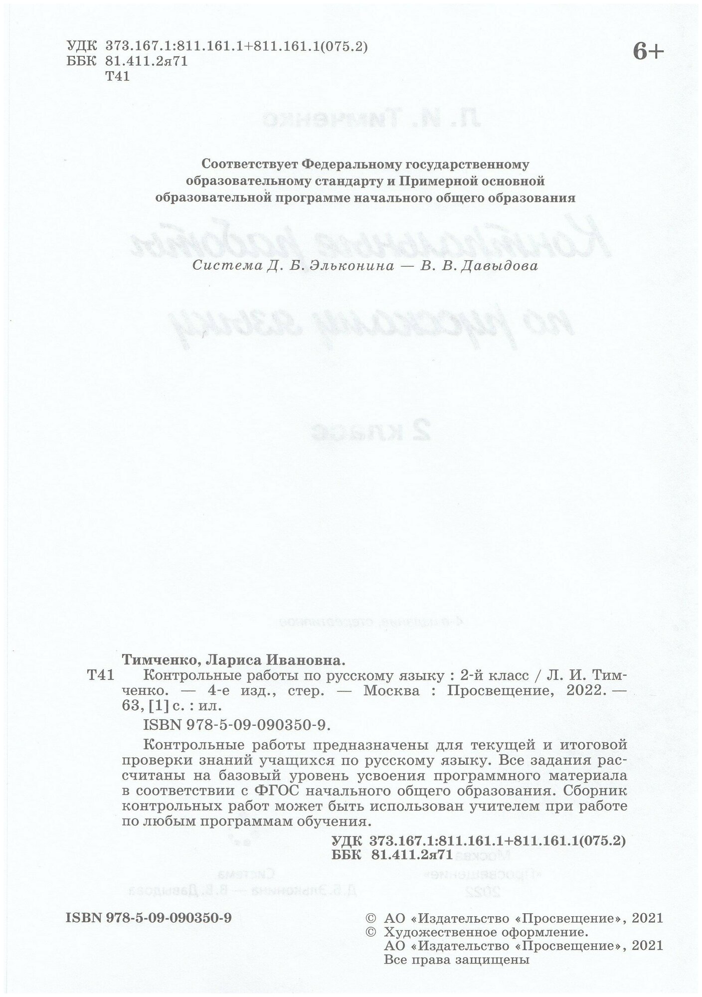 Контрольные работы по русскому языку 2 класс Система Д Б Эльконина - В В Давыдова (Лариса Ивановна Тимченко); Просвещение, 2023