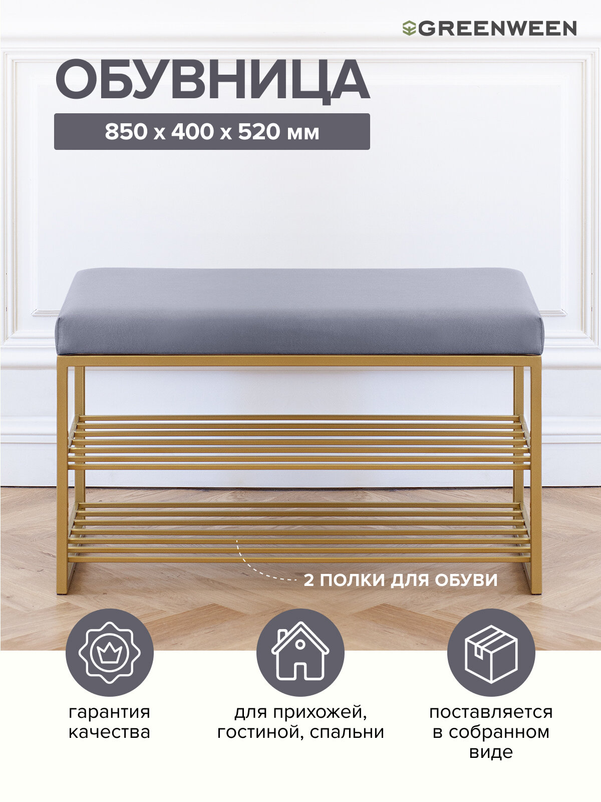 Банкетка обувница GARDA от GreenWeen - лучшая альтернатива обувнице икеа. Обувница с сиденьем в прихожую не займет много места, но будет максимально функциональной благодаря двум полкам и скамье, обитой велюром.