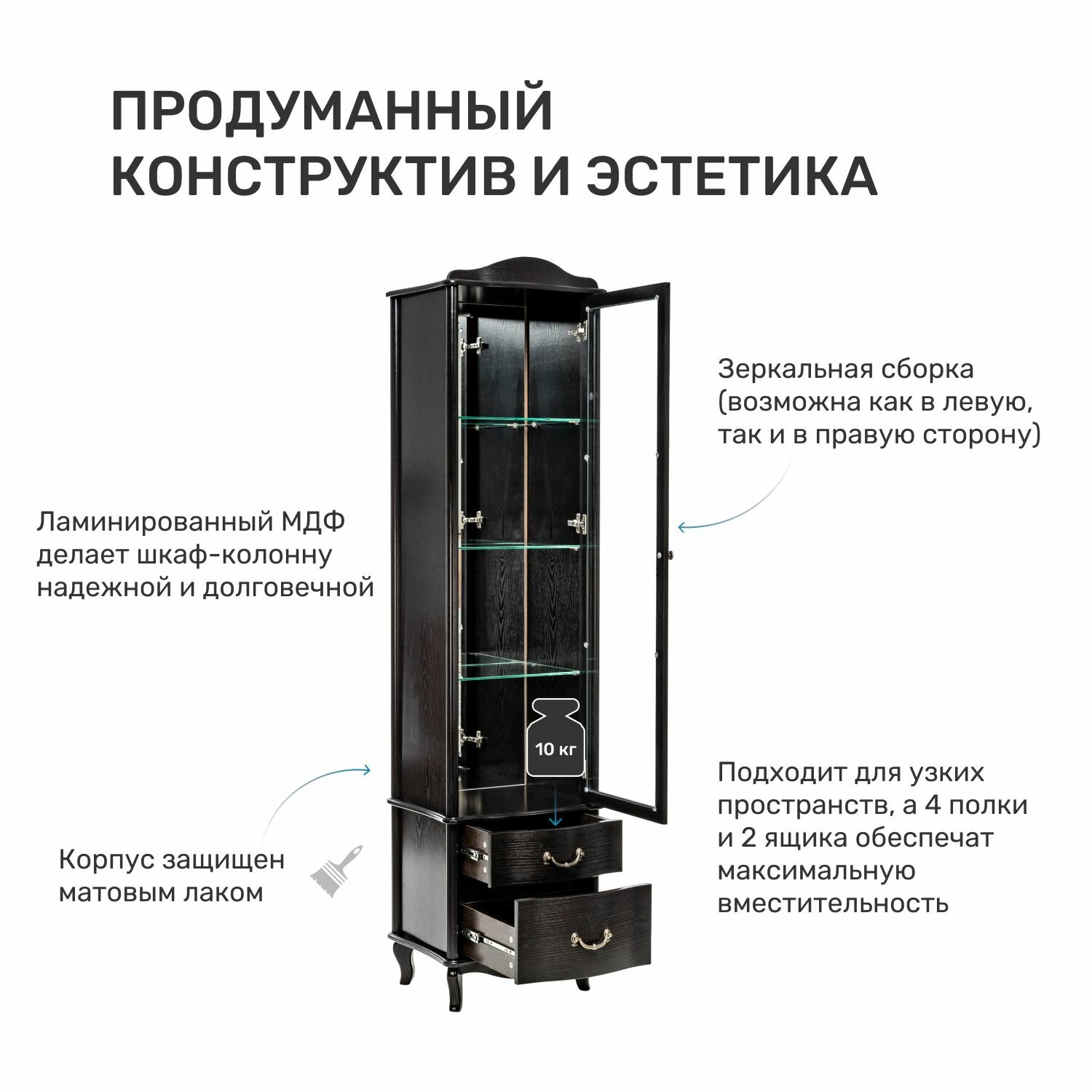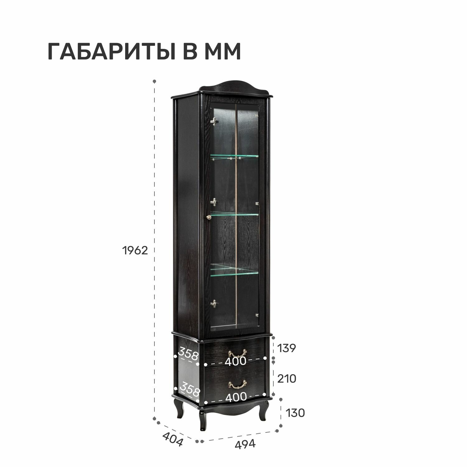Узкий шкаф-витрина, украсит своим присутствием Ваш интерьер, сделает его стильным и элегантным. Функциональные вместительные полки расширят свободное пространство в комнате. Разнообразие классических цветов дает возможность подобрать витрину Афина в предпочтительной цветовой гамме. При желании шкаф «Афина» можно сделать совершенно особенным с помощью дополнительной отделки на любой вкус, такой, как золотая патина или матовый лак. Зеркальная сборка (возможна в левую и правую сторону). Верхний ящик (ШхГхВ, мм): 400х139х358. Нижний ящик (ШхГхВ, мм): 400х210х358. Высота опоры (ножек) — 130 мм. Расстояние между отверстиями под ручки - 96 мм.