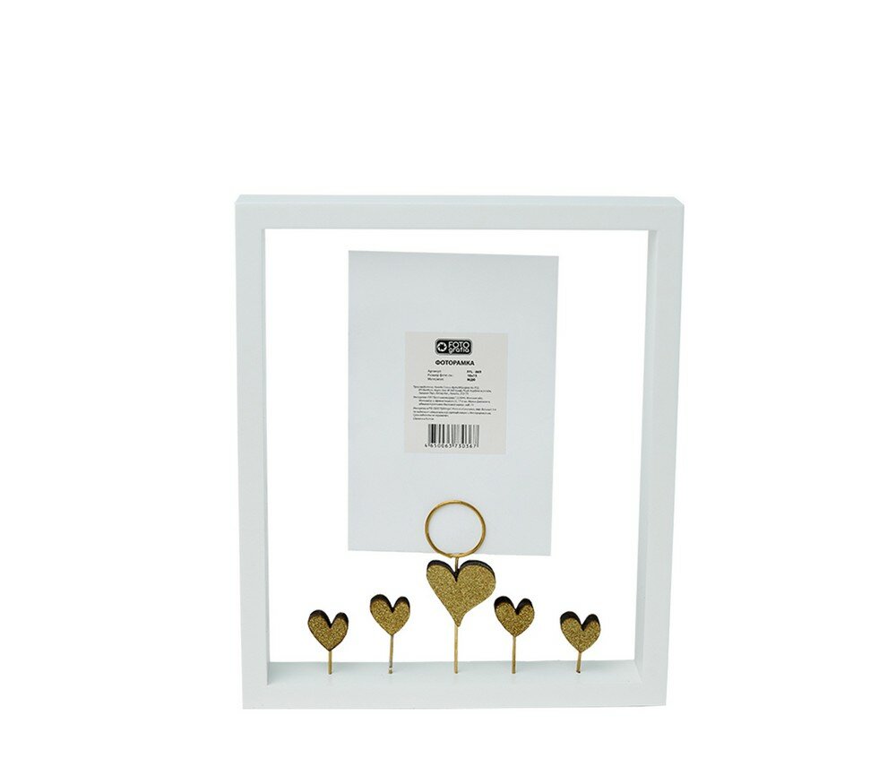 Рамка для фотографии формата 10х15 см. Фотография крепится в золотистый пружинный зажим, стекло у этой модели отсутствует. Украшением рамки является пять объемных сердец на металлических проволоках, покрытых золотистыми блестками. Сама рамка выполнена из МДФ, древесного волокна – достаточно легкого и при этом прочного, долговечного и экологически безопасного материала. Дизайн хорошо подходит для романтических и семейных снимков. Рамка ставится на стол или полку, благодаря широкому основанию ей не нужна ножка. Бренд Fotografia объединяет под собой коллекции фотоальбомов и рамок.Рамки Fotografia с вашими любимыми фотографиями станут отличным украшением любого интерьера. Они хорошо подходят в качестве подарка: например, на День рождения, юбилей или годовщину свадьбы.