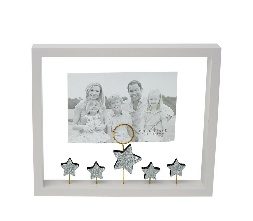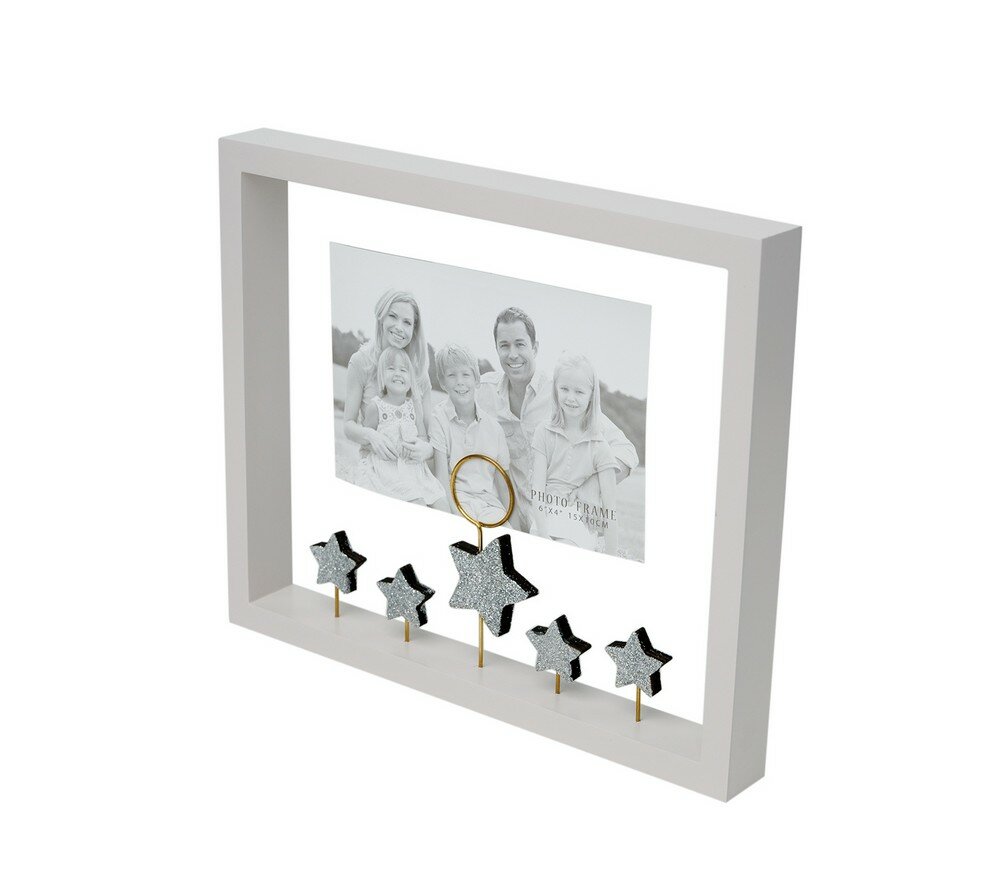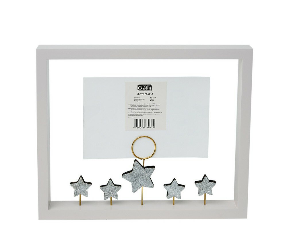 Фоторамка Звездочки послужит красивым обрамлением группового семейного портрета или снимка, запечатлевшего самые яркие моменты летнего отдыха. Аксессуар предназначен для установки на плоской поверхности – полке стеллажа, письменном столе, прикроватной тумбе. За счет ширины и прочности выполненной из МДФ рамы изделие устойчиво стоит без дополнительной опоры. Края планок соединены с помощью крепежей, расположенных внутри профиля, что обеспечивает их плотную фиксацию. Окрашенный в белый цвет багет очень оживляют декоративные элементы в виде сверкающих серебристых звездочек.