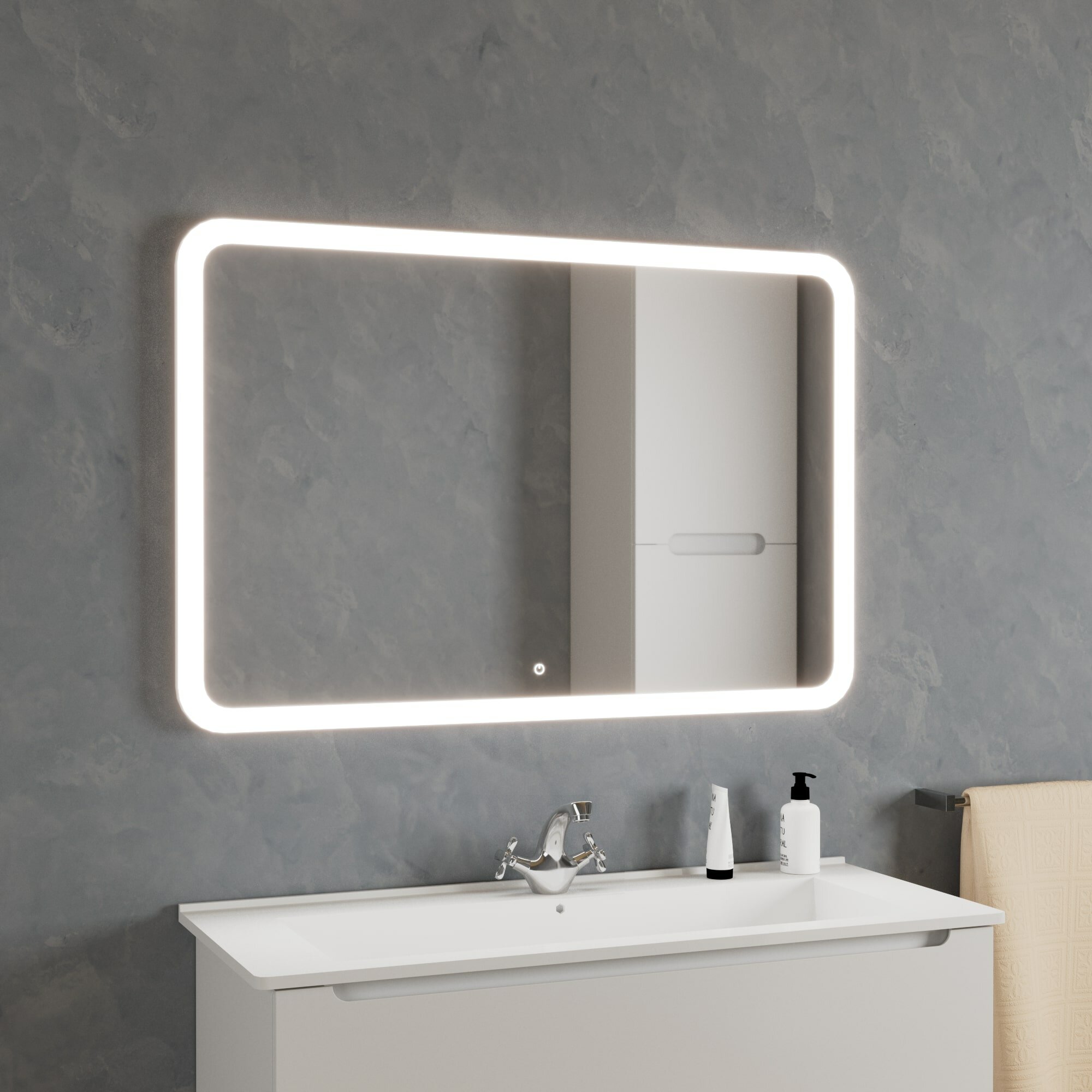 Светодиодное зеркало ORINOKO 1050х700 изготовлено из зеркального полотна толщиной 4 мм. В качестве элемента LED-подсветки используется светодиодная лента с плотностью диодов 120 шт./м мощностью 9,6Вт/м. Электрические компоненты размещены внутри корпуса из высококачественного УПС-пластика. Край полотна обработан еврокромкой. Управление подсветкой осуществляется при помощи сенсорной кнопки, вынесенной на лицевую панель. Зеркало поставляется в комплекте с настенным крепежом.