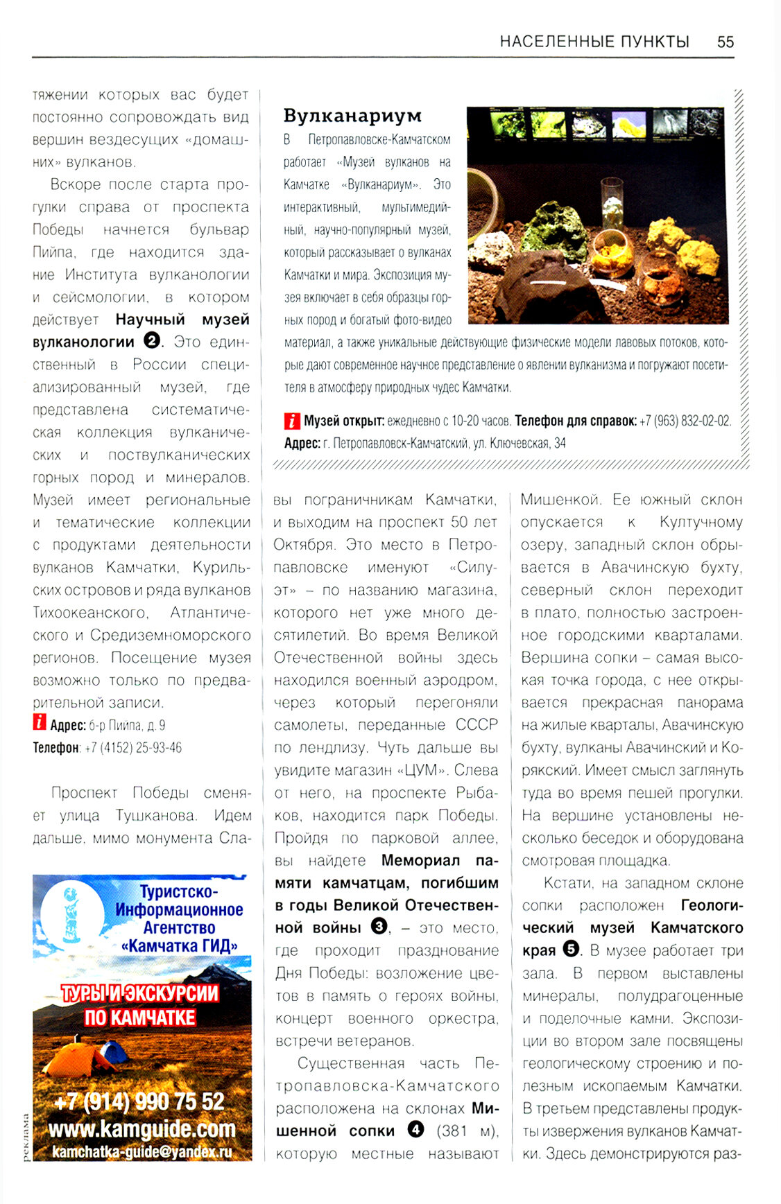 Путеводитель включает в себя подробную информацию об инфраструктуре и достопримечательностях Камчатского края. Описание исторических и культурных объектов сопровождается познавательной информацией об истории региона, традициях и быте коренных народов края, особенностях климата, флоре и фауне. Книга иллюстрирована авторскими фотографиями, снабжена картами и планами крупных населенных пунктов.