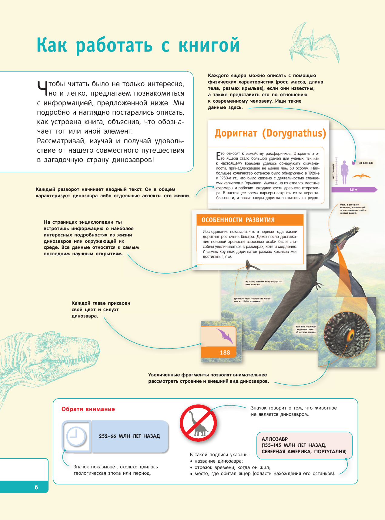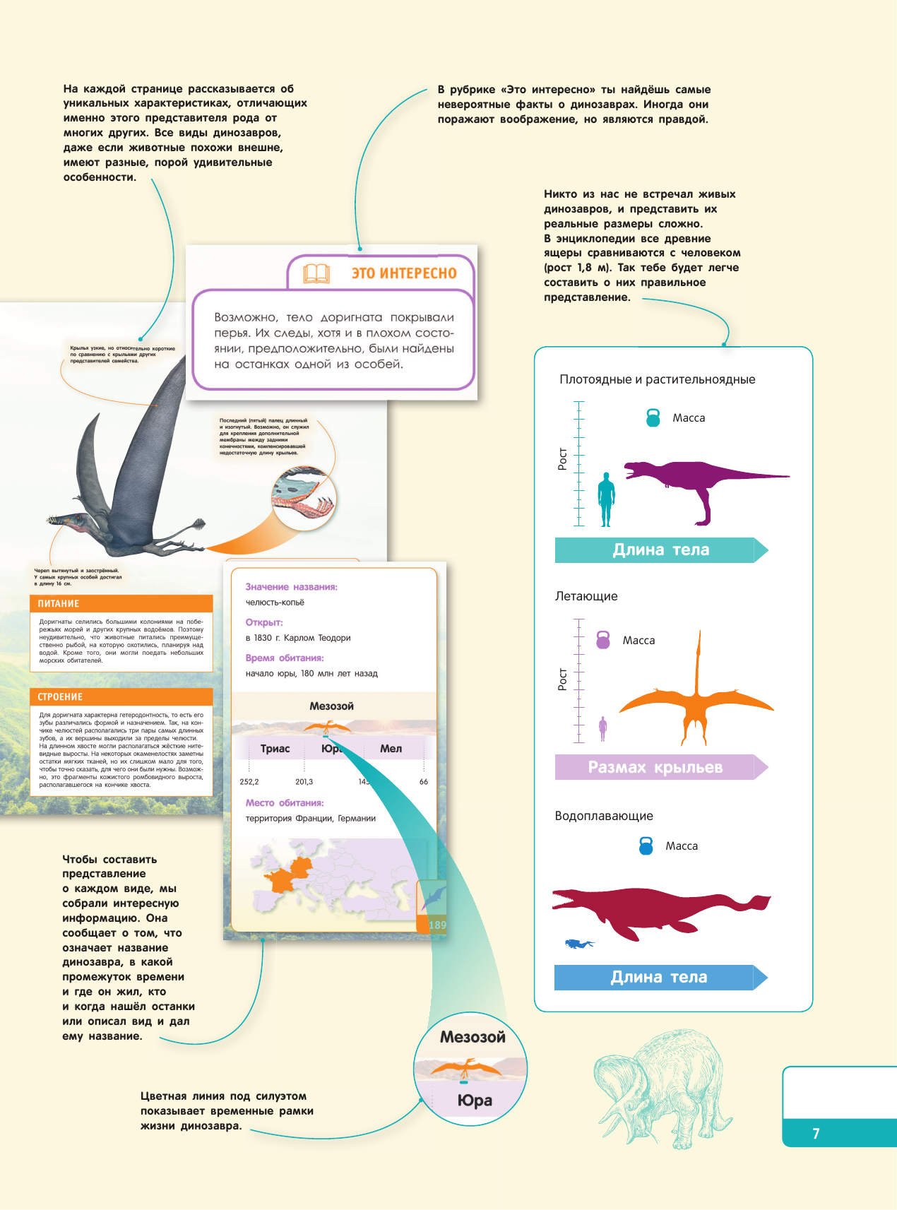 Благодаря подробным статьям этой энциклопедии ты узнаешь самое интересное о том, где они обитали, какой образ жизни вели, чем питались и какими невероятными особенностями обладали. А замечательные иллюстрации позволят рассмотреть любого динозавра во всех подробностях!