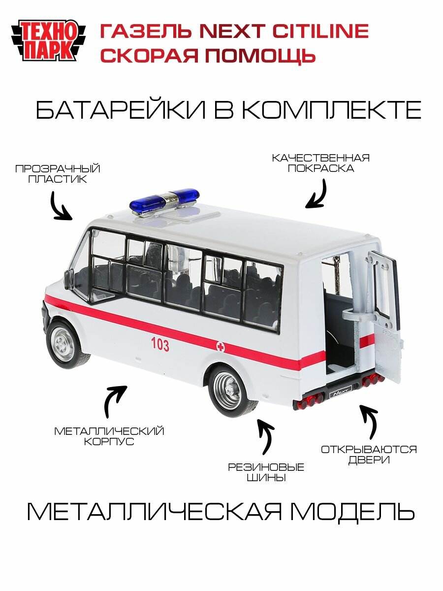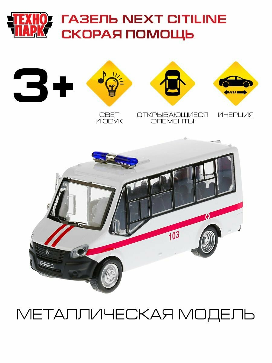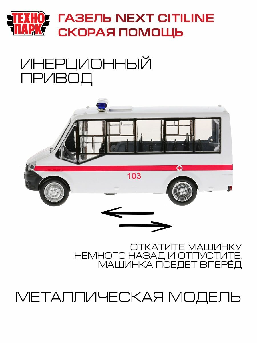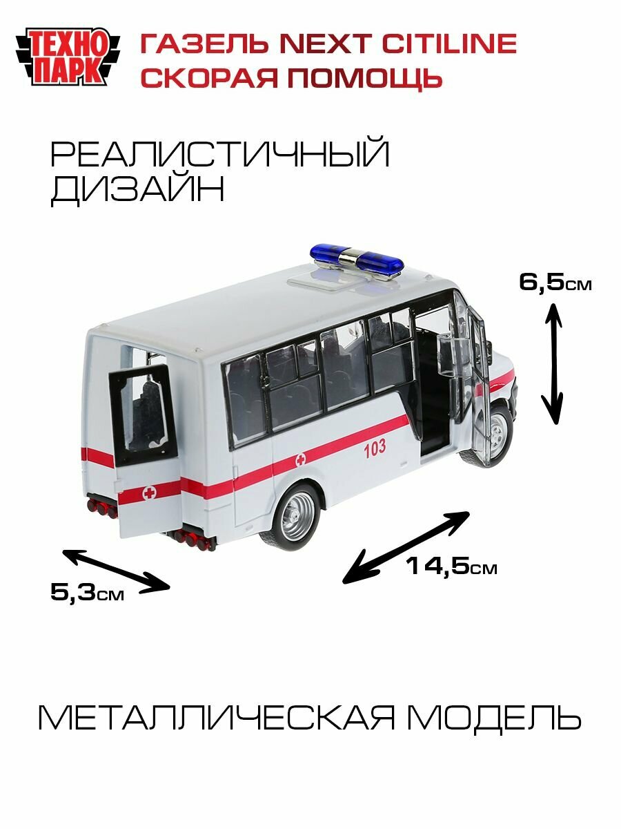 Машина Технопарк "Газель Next Citiline" Скорая 14 см арт.NEXTCITI-15SL-AMB