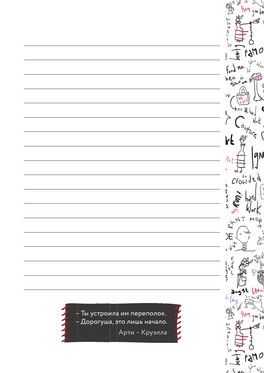 Прикоснитесь к истории великолепной и дерзкой Круэллы! Записывайте свои планы и мысли, мечтайте, творите и черпайте вдохновение из высказываний и стиля самой яркой злодейки Disney!