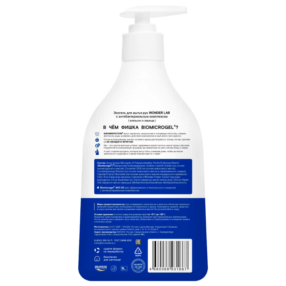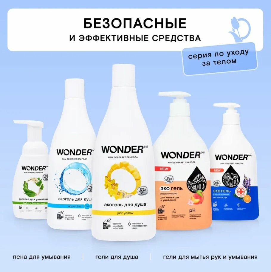 Жидкое мыло для рук и лица WONDER LAB объёмом - 540 мл. Эко гель создан специально для мытья рук и умывания. Средство для рук бережно очищает, смягчает, успокаивает кожу. А также подходит для удаления остатков косметики. Гель для рук Вандер Лаб отлично удаляет неприятные запахи, поэтому необходим как в ванной, так и на кухне. Формула эко мыла жидкого для рук pH нейтральна, полностью смывается водой, не сушит и не раздражает кожу. Средство для мытья рук и умывания абсолютно безопасно для всех членов семьи, природы не вызывает аллергических реакций. Мыло также подходит для мытья детских игрушек и сосок ребенка. Густое мыло экономично расходуется и создает плотную эффективную пену. Инновационная формула не нарушает экосистему водоемов, так как не содержит агрессивных компонентов. Гипоаллергенный гель для умывания лица, поддерживает естественный pH кожи. Натуральное туалетное мыло полностью смывается водой и безопасно для всей семьи. Мужское и женское жидкое мыло для рук и лица WONDERLAB не сушит кожу и обладает антисептическим эффектом, полностью смывается водой. Eco крем мыло - это отличный подарок женщине или мужчине. Жидкое мыло Wonder Lab можно использовать как кухонное, так и в ванну или туалет, так как оно прекрасно удаляет неприятный запах. Органическое мыло подходит для взрослых и детей всех возрастов. Увлажняющее мыло создано на основе кокосового масла. Маленькое косметическое мыло объем которого чуть больше 500мл подойдёт как умывалка для лица.Способ применения: Нанесите небольшое количество геля, нажав на дозатор, помойте руки как обычно. Гель подходит для умывания и снятия легкого макияжа: для этого нанесите небольшое количество геля на руки, вспеньте, нанесите на лицо, смойте пенку водой. Не поддерживаем тестирование на животных. Мы называем наши продукты экологичными, потому что основа Biomicrogel, который разлагается на 98 процентов за 24 часа. Средства мы делаем из овощей и фруктов. Средство без фосфатов и фосфонатов. Безопасно для септиков. Мыло ароматизированное: выберите аромат на свой вкус.