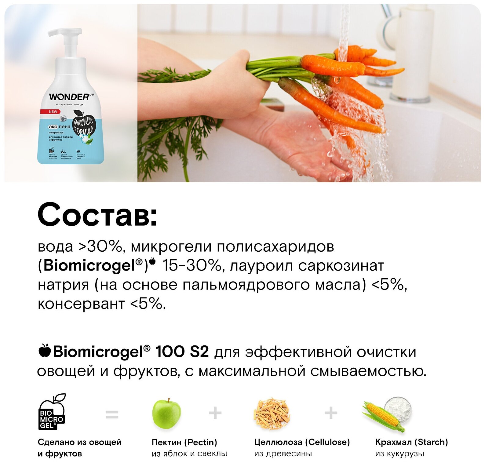 Эко пена для мытья овощей, фруктов и ягод от WONDER LAB смывает загрязнения, консерванты, воск и следы других типов обработки с плодов. Пенка позволяет тщательно промыть кожуру, не проникает внутрь плода и полностью смывается в считанные секунды. Благодаря нежной консистенции пенка мягко обволакивает поверхность фруктов, овощей и ягод, легко смывается водой без остатка. В основе экологичного средства - инновационный компонент Biomicrogel, который сделан из овощей и фруктов. Благодаря этому компоненту, средства WONDER LAB безопасны для человека, не вредят окружающей среде, не содержат токсичных компонентов и разлагаются на 98% за 1 день. В основе всех средств WONDER LAB - инновационный компонент Biomicrogel. Он сделан из овощей и фруктов: из яблочного жмыха, свекольного жома, корзинок подсолнухов, кукурузы и других продуктов вторичной сельхозпереработки.