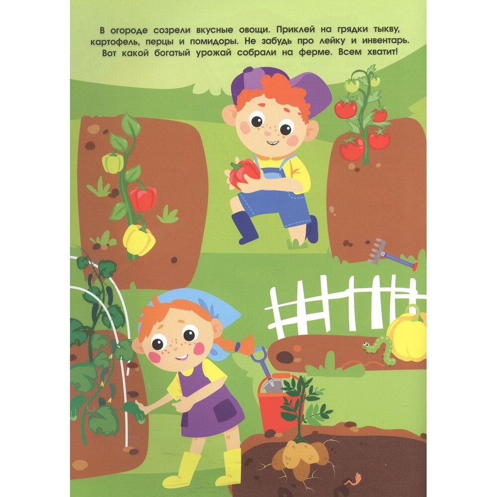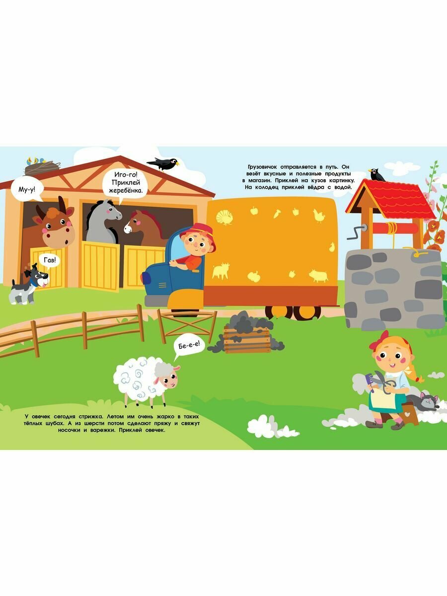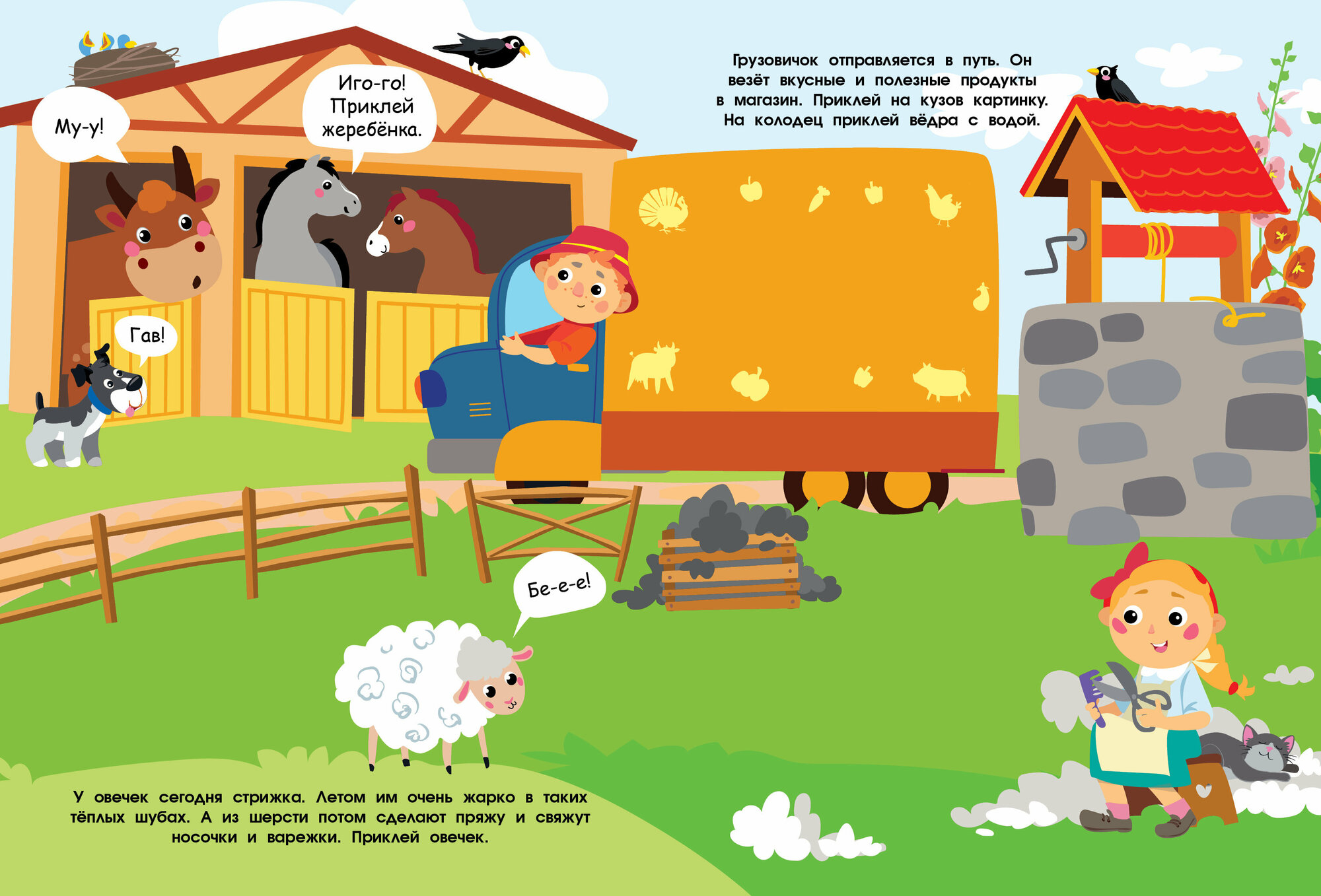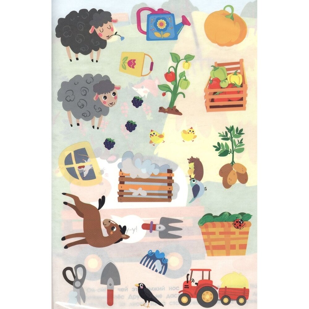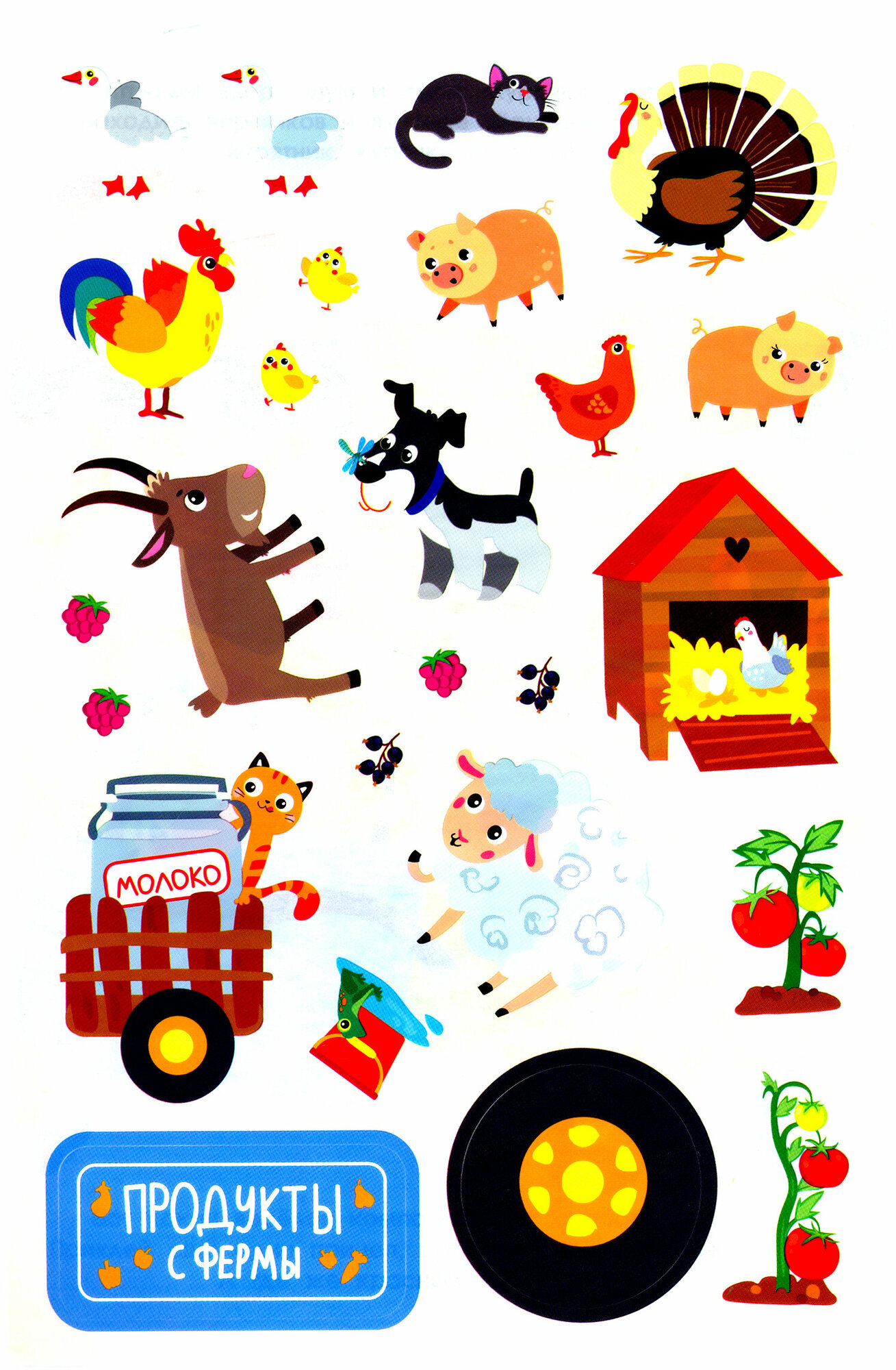 Приходи в гости на нашу ферму. Тут можно покормить домашних животных и узнать, как они говорят, подстричь овечек, собрать урожай, прокатиться на тракторе и отправить в магазин полезные продукты. С нашими многоразовыми наклейками будет очень интересно. Придумывай свои весёлые истории и приклеивай картинки снова и снова!