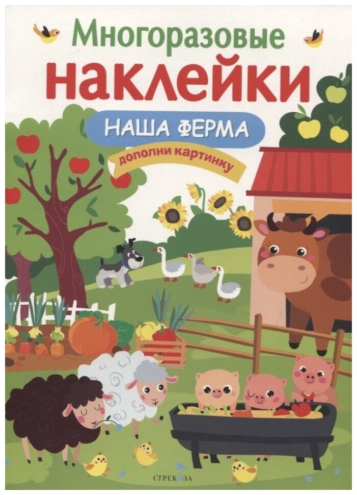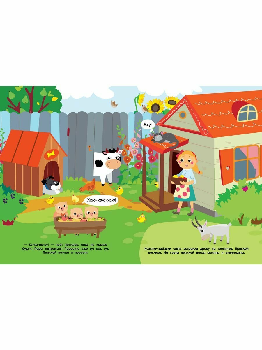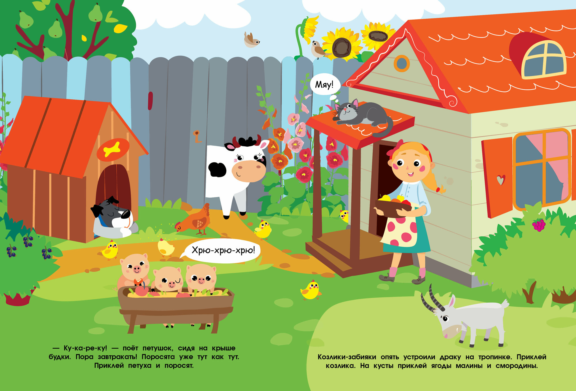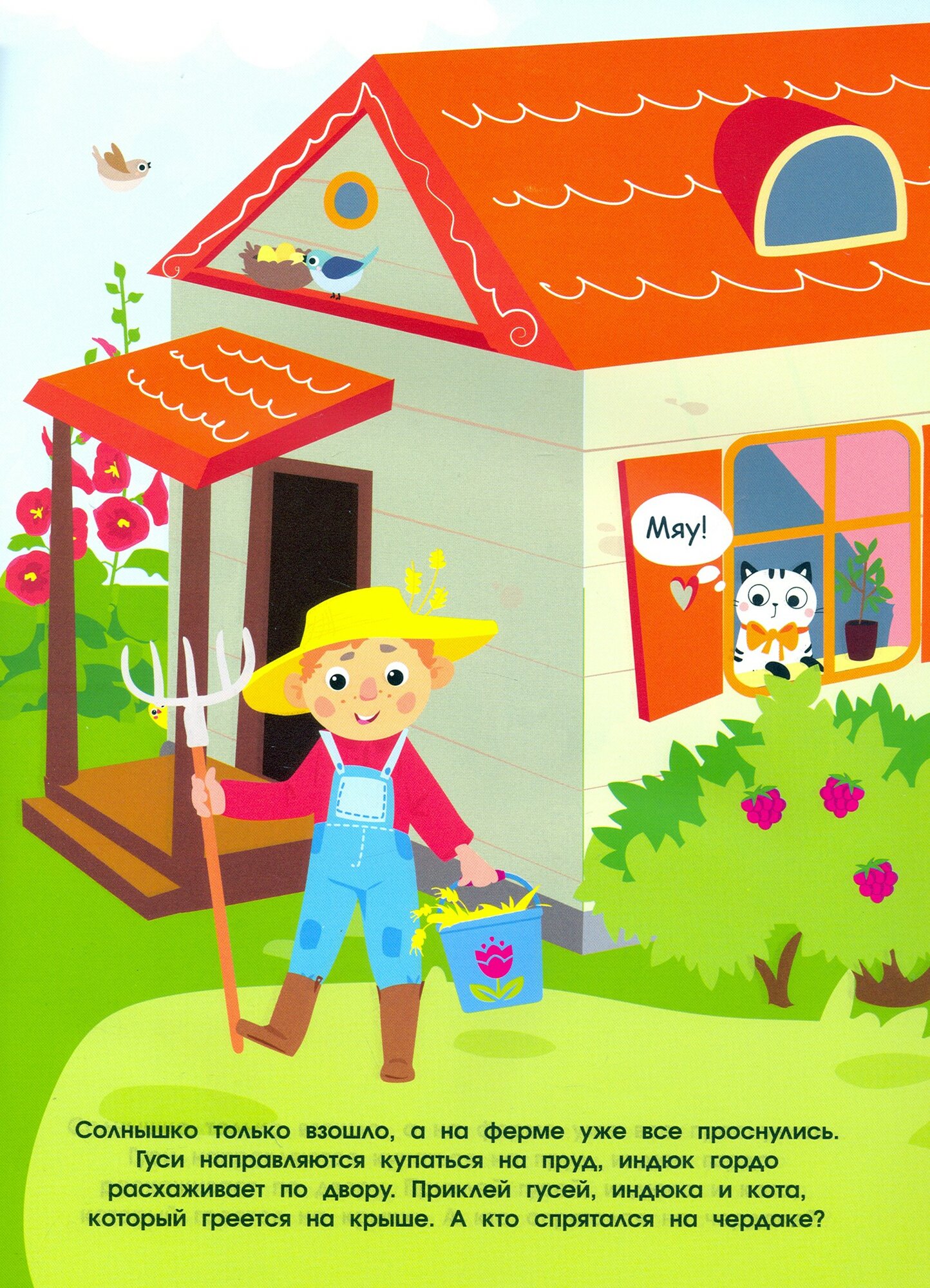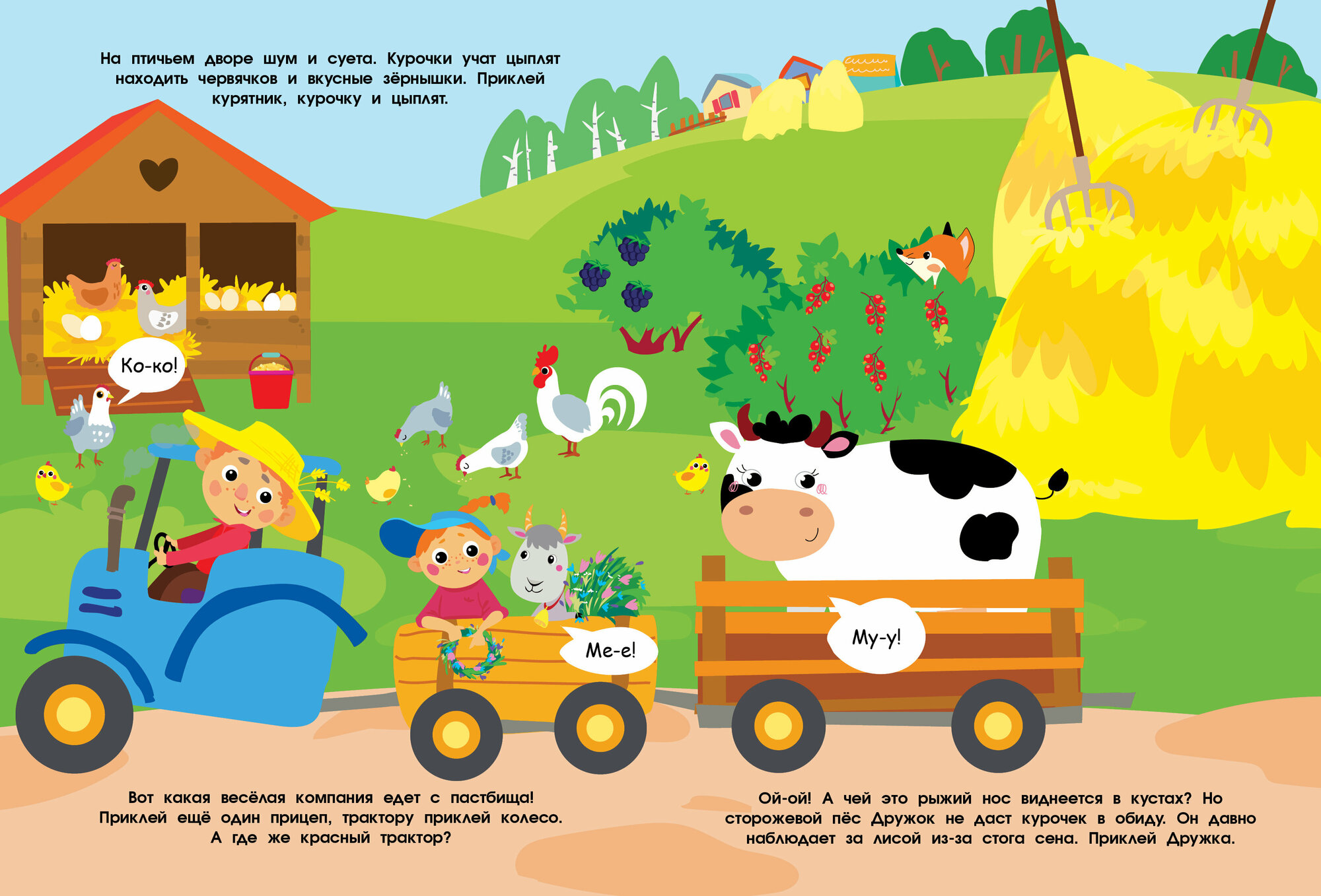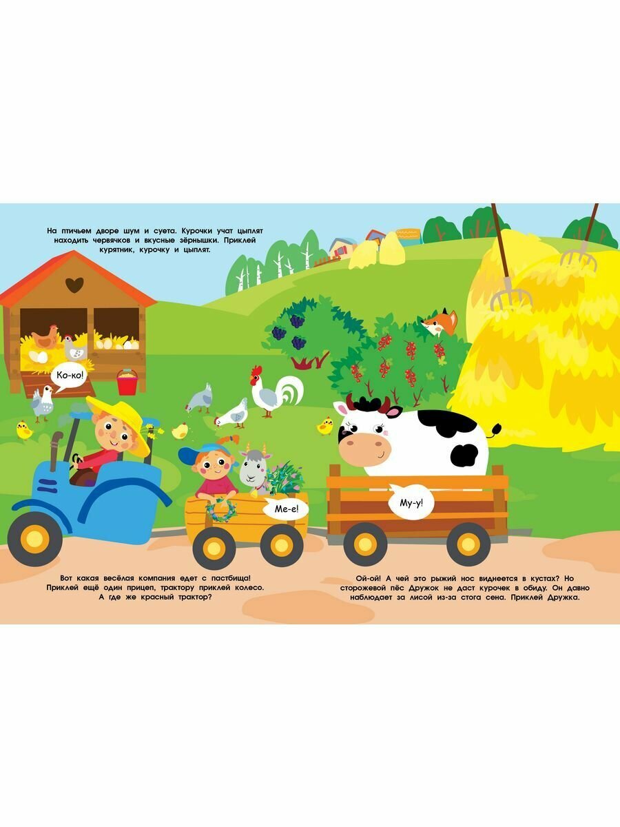 Приходи в гости на нашу ферму. Тут можно покормить домашних животных и узнать, как они говорят, подстричь овечек, собрать урожай, прокатиться на тракторе и отправить в магазин полезные продукты. С нашими многоразовыми наклейками будет очень интересно. Придумывай свои весёлые истории и приклеивай картинки снова и снова!