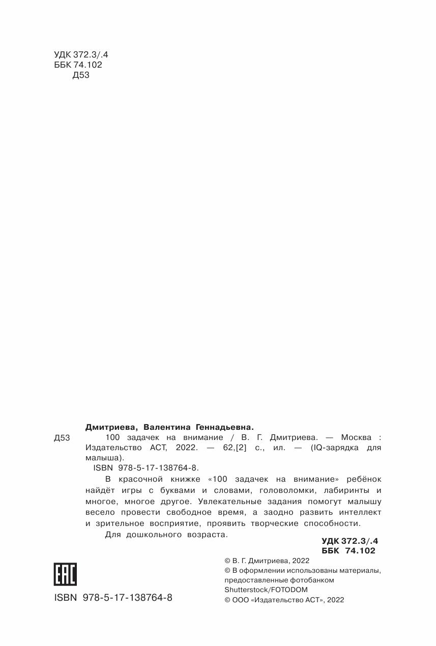Книга: 100 задачек на внимание (Дмитриева Валентина Геннадьевна); Сова. Малыш (Обучающая и развивающая литература), 2022