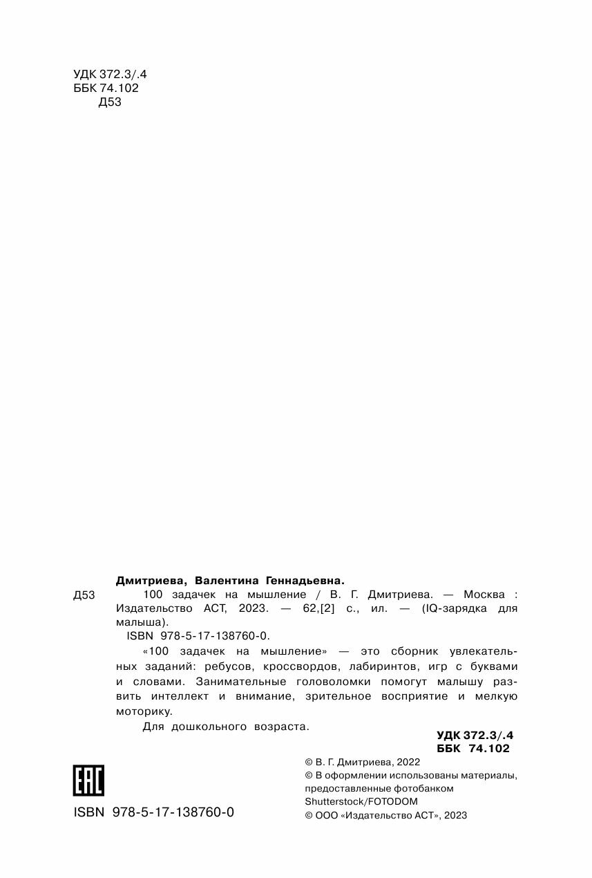Сервис сравнения цен СкидкаГИД предлагает сравнить цены на товар «Книга: 100 задачек на мышление (Дмитриева Валентина Геннадьевна); Сова. Малыш (Обучающая и развивающая литература), 2022»