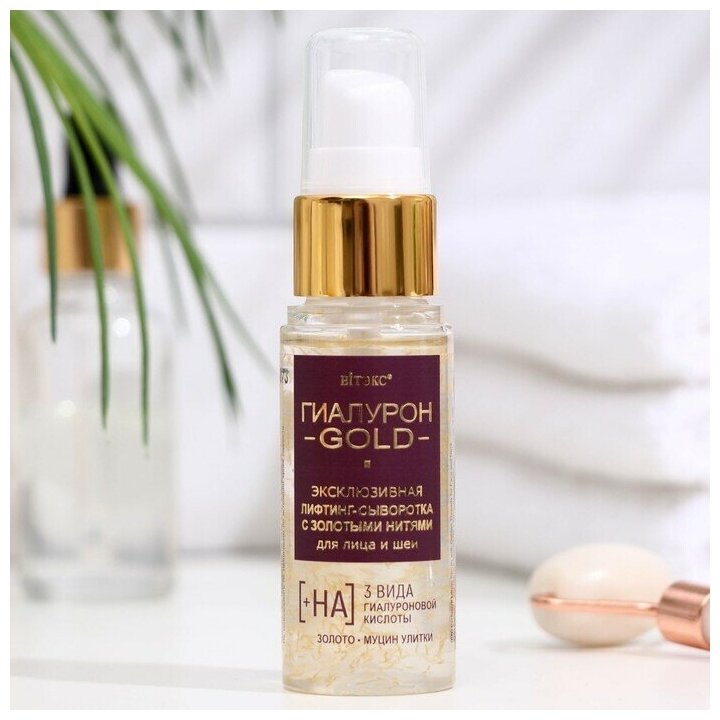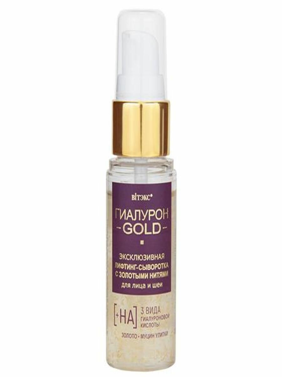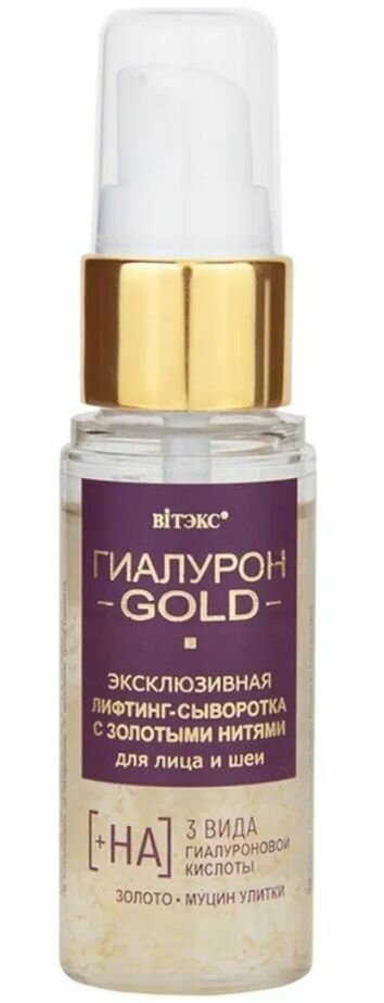 Золотые нити показали невероятную эффективность для быстрых видимых результатов в омоложении кожи, разглаживании морщин и подтягивании овала лица. В научном центре компании витэкс была создана эксклюзивная лифтинг-сыворотка с золотыми нитями – безопасная и по-настоящему действенная альтернатива инъекционным методам омоложения.Невесомая шелковистая текстура моментально создает на поверхности кожи микросетку, которая, как невидимый каркас, подтягивает и укрепляет контуры лица и шеи, минимизирует видимость морщинок и заломов, «стирает» все признаки возраста и усталости, делает цвет лица однородным, свежим и красивым.В основе формулы –гиалуроновая кислота трех молекулярных размеров, которая проникает во все слои эпидермиса, активизируя глубокий клеточный метаболизм и возрождая ресурс молодости кожи.1. Высокомолекулярнаягиалуроновая кислота увлажняет кожу вверхних слоях, подтягивает, выравнивает ее тон, дарит свежий, яркий, сияющий цвет лица.2. Среднемолекулярнаягиалуроновая кислота проникает всредние слоикожи, стимулирует выработку собственной гиалуроновой кислоты, повышает упругость, плотность и эластичность кожи.3. Низкомолекулярная гиалуроновая кислота действует в самых глубоких слоях эпидермиса, наполняя кожу влагой и «выталкивая» морщинки изнутри, укрепляя и подтягивая контуры лица, обеспечивает мощный и продолжительный эффект лифтинга.Доказанная эффективность гиалурона*Увеличение синтеза собственной гиалуроновой кислоты +93%Улучшение гладкости кожи +66%Стимуляция синтеза коллагена +21%Биозолотов золотых нитях выступает в роли проводника, позволяя активным компонентам быстрее и глубже проникать в кожу, значительно повышая эффективность их воздействия, усиливая процессы омоложения. В комплексес гиалуроновой кислотой и муцином улиткистимулирует клетки вырабатывать собственный коллаген, эластин и гиалуроновую кислоту, улучшает упругость и плотность кожи, позволяет надолго сохранить молодость кожи и четкие гармоничные пропорции лица.Муцин улитки благотворно влияет на процессы омоложения, активно восстанавливает, осветляет и подтягивает кожу, разглаживает все виды морщин, эффективно замедляет образование новых.Результат: всего несколько драгоценных капель этой эксклюзивной сыворотки – и кожа мгновенно преображается: подтягивается, разглаживается, наполняется упругостью и красивым молодым сиянием. Эффект особенно заметен на сухой, обезвоженной, увядающей, тусклой, а также зрелой коже. Максимальный результат достигается при комплексном применении средств линии. Эффект накапливается и сохраняется надолго.Подходит для кожи любого типа.Рекомендуется использовать с 40 лет.