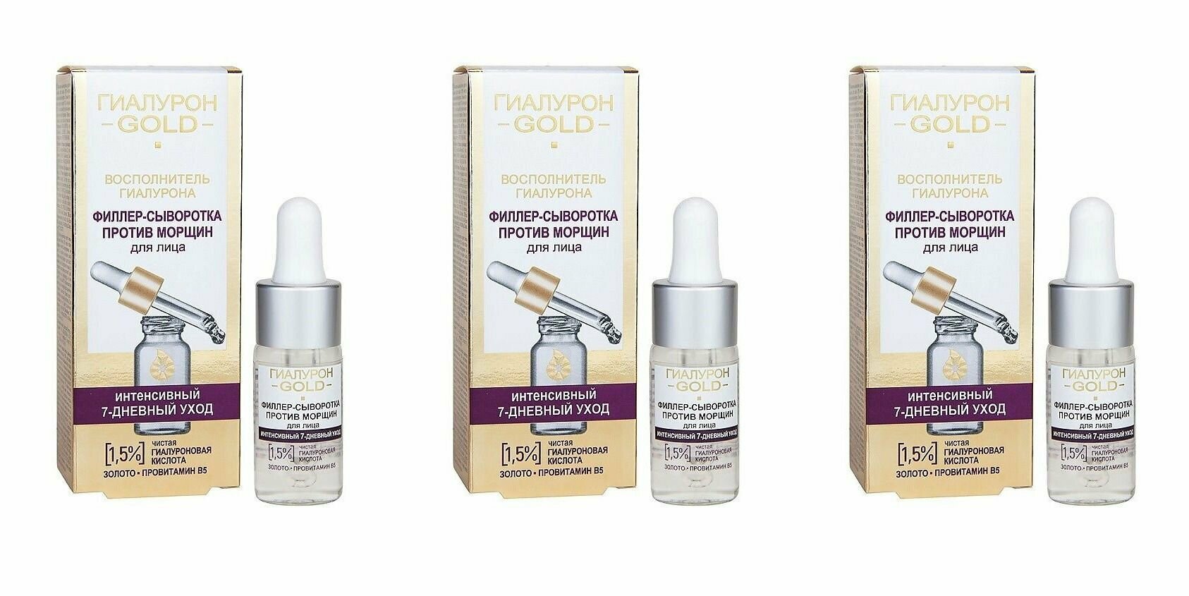 В результате многолетних исследований в научном центре компании витэкс было создано мощнейшее омолаживающее средство - филлер-сыворотка с самой высокой концентрацией чистой гиалуроновой кислоты. Всего за 7 дней этот восполнитель гиалурона помогает значительно разгладить морщины и возродить ресурсы молодости кожи. Легкая, шелковистая текстура моментально окутывает кожу невесомой омолаживающей вуалью, которая длительное время остается на коже, наполняя ее необходимой гиалуроновой кислотой и другими драгоценными элементами, которые трудно получить из других внешних источников. В комплекте 3 штуки