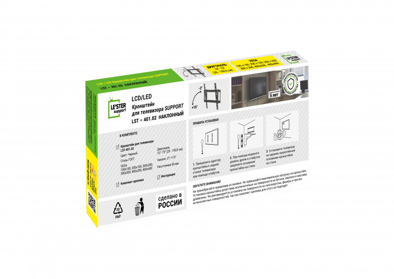Настенный наклонный кронштейн для TВ LESTER LST-401.02 предназначен для дисплеев с диагональю от 10 до 75 дюймов. Он подходит для телевизоров и мониторов весом до 45 кг. Простая конструкция позволит установить кронштейн легко и быстро.