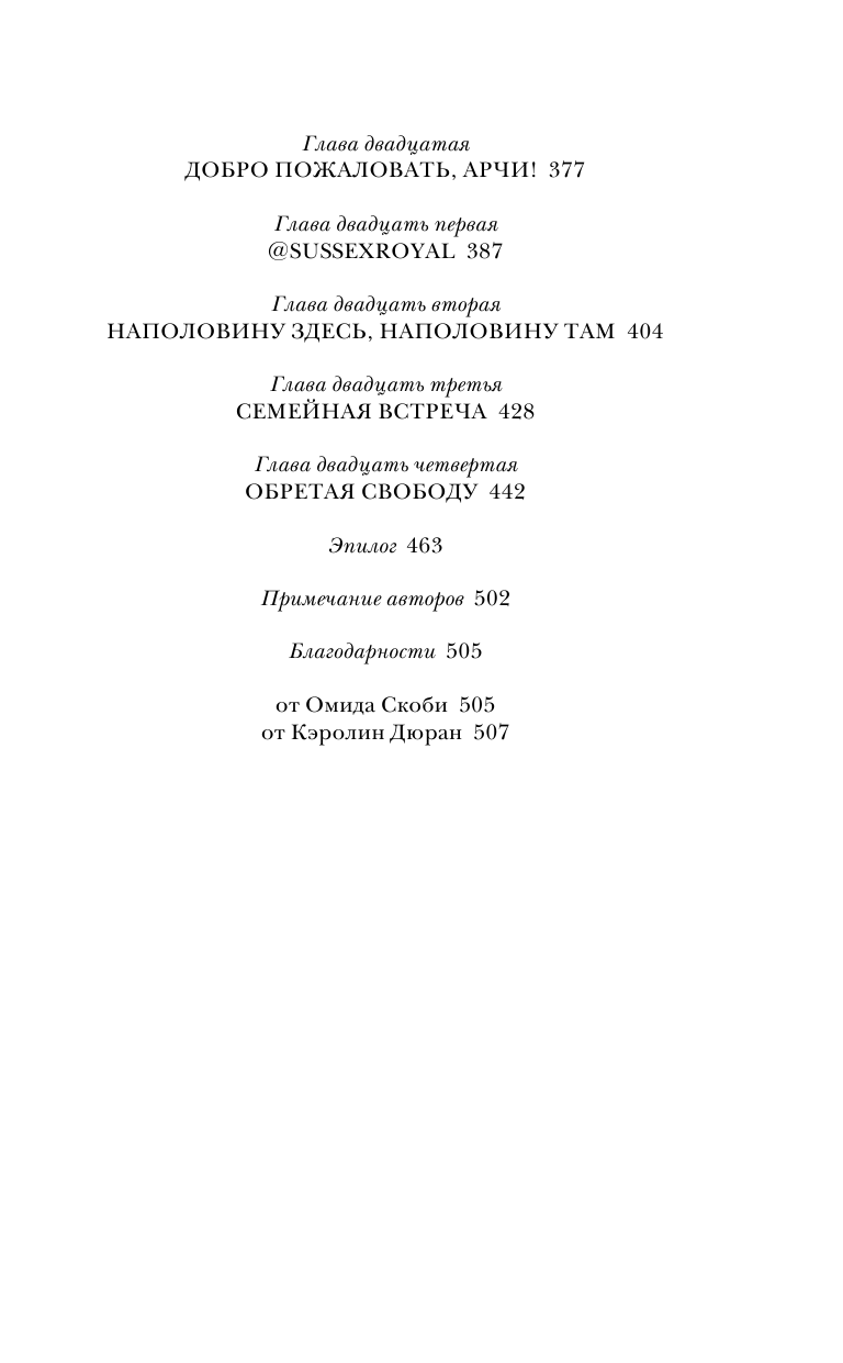 Омид Скоби и Кэролин Дюран лучше других знают всю подноготную жизни знаменитой пары. В своей книге они развенчивают слухи о Сассексих и раскрывают истинные причины размолвки в семействе Виндзоров, отказа от титулов и побеге в США.
