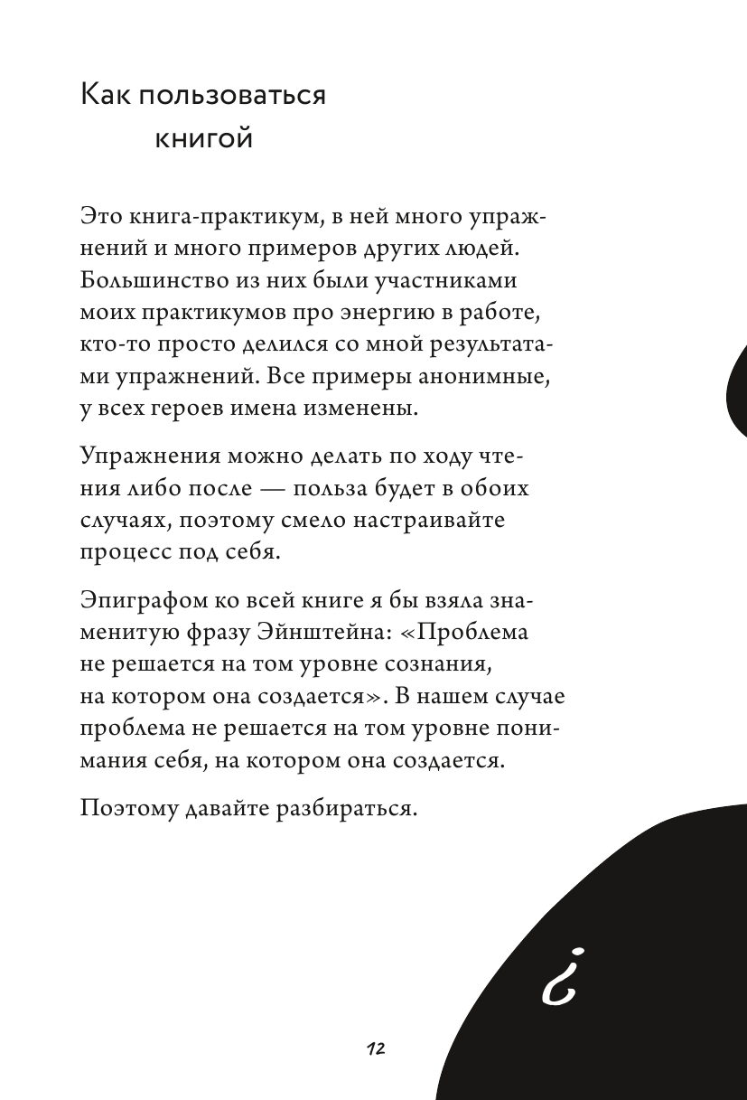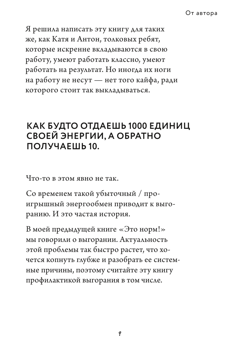 Иллюстрированная книга от Елены Резановой о том, как сонастроиться с самим собой, чтобы работа начала заряжать и приносить радость. Это книга-практикум: материал прикладной и связанный с вашей повседневной реальностью. Внутри вы найдете тесты, чек-листы и результаты научных исследований.