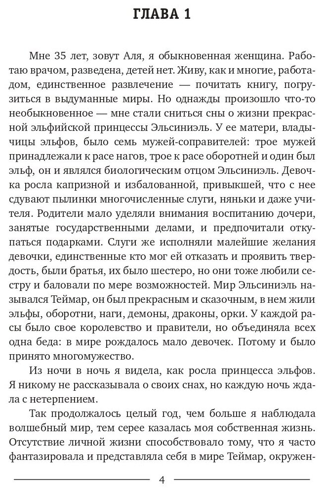 Ну, зато новоявленной эльфиечки прям таки повезло, куча поклонников, много секса, большое количество мужиков. Дорвалась баба что сказать! Конечно помимо очень чувственных, а временами горячих сцен у нас будет и юмор, и сюжет. Девушке предстоит разобраться в хитростях брачных договоров, узнать новый мир, поближе познакомиться с новоявленными женихами и братьями. И да, с некоторыми ОЧЕНЬ близко!)) ??????