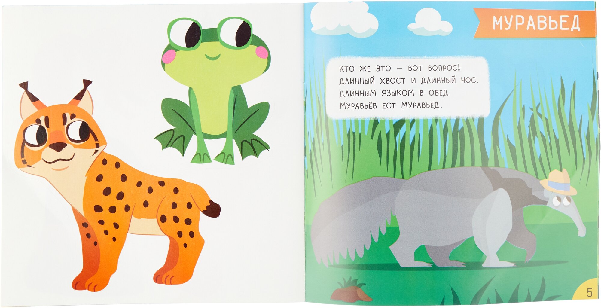 Небольшая книжка, с глянцевой обложкой. Стихи легкие и небольшие, удобные для малыша. Развороты в наклейками в хаотичном порядке, дабы ребенок самостоятельно нашел куда клеить зверей.