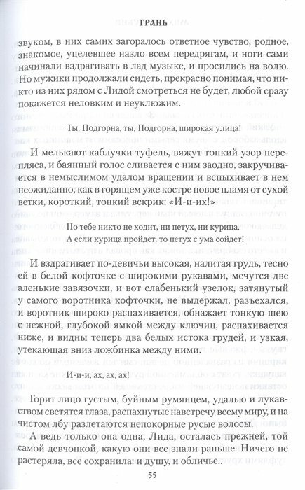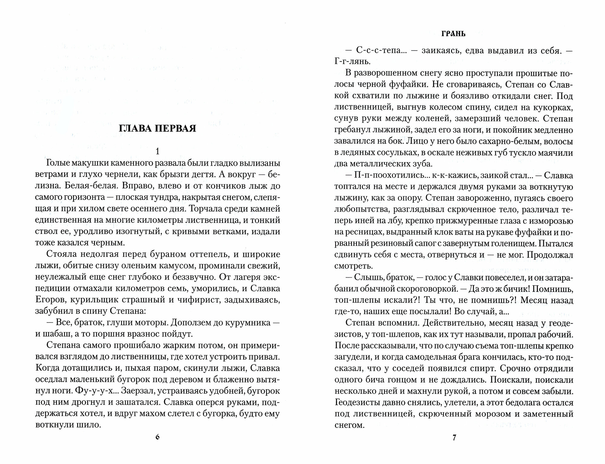 Книга очень интересная и я бы сказала не очень легкая по сюжету,так как на протяжении всего романа постоянно переживаешь за главного героя и его семью.У каждого в жизни есть своя Грань,и в данном романе Степан,а это и есть главный герой,не побоялся в одиночку встать против в основном верхушки власти отдельно взятой деревни в которой он сам и проживает.А верхушка как всем известно и это не тайна,рука - руку моет и всегда выходит из любой ситуации безнаказанно.Человек оказался крепким духом и с верой в душе,что он может что-то изменить в этой жизни,но он один,а как гласит всем известная поговорка -один в поле не воин.И такие как Бородулин,Пережогин,Ленечка и т.д.всегда были и будут.Несколько страниц из книги.