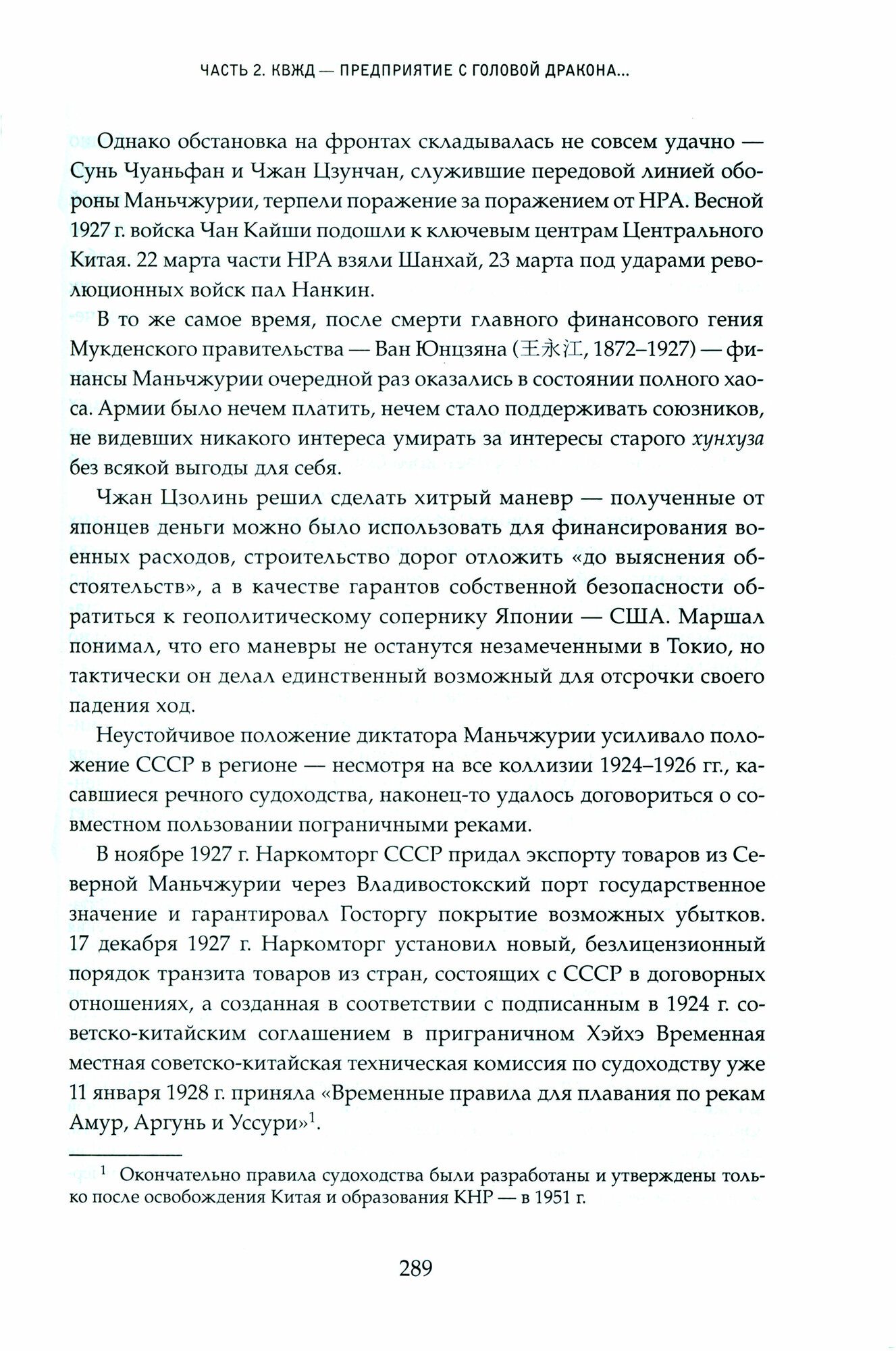 Вторая глава (200 с лишним стр.) подробно освещает эту тему. Она посвящена событиям с конца 19 в. по конец 1920-х гг. и охватывает, кроме строительства КВДЖ, Первую мировую войну, революцию и Гражданскую войну в России, а также годы НЭПа. Здесь содержится много интересного и мало известного материала. Интересно, что единственный период подъема КВЖД пришелся на годы мировой войны, когда по ней шла потоком перевозка закупленных царским правительством грузов у Японии и США. В годы Гражданской войны русское влияние на Дальнем Востоке было практически утрачено. Китай же, наоборот, усилился, и, приняв участие в вооруженной интервенции союзников (США и Японии) в русском Забайкалье, Приморье и Приамурье, начал делать попытки овладеть КВЖД. Восстановив в 1924 г. отношения с Советской Россией, Китай, будучи заинтересован в материальной помощи от нас, организовал совместное управление КВЖД. Но в 1926–27 гг. китайцы стали уничтожать своих коммунистов, поддерживаемых большевиками, и ситуация резко ухудшилась.