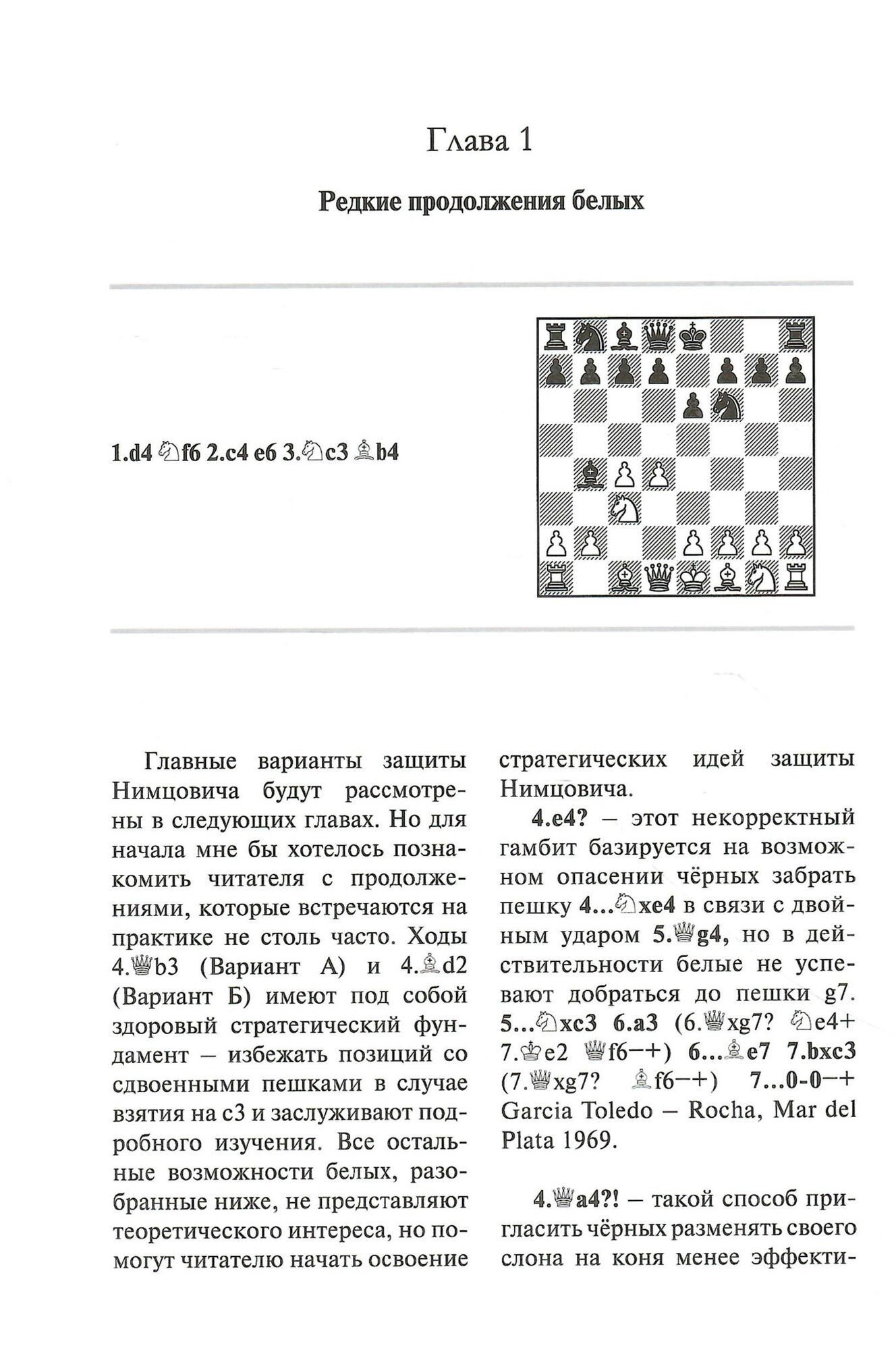 Книга известного гроссмейстера Игоря Лысого поможет шахматисту-разряднику включить в свой дебютный репертуар защиту Нимцовича. Автор совешил попытку написать о дебюте, не перегружая книгу многочисленными компьютерными вариантами. Лично мне очень понравился раздел с примерными партиями, я считаю, что знакомство с книгой стоит начать именно с него, это поможет лучше усвоить идеи дебюта перед тем, как переходить непосредственно к вариантам.