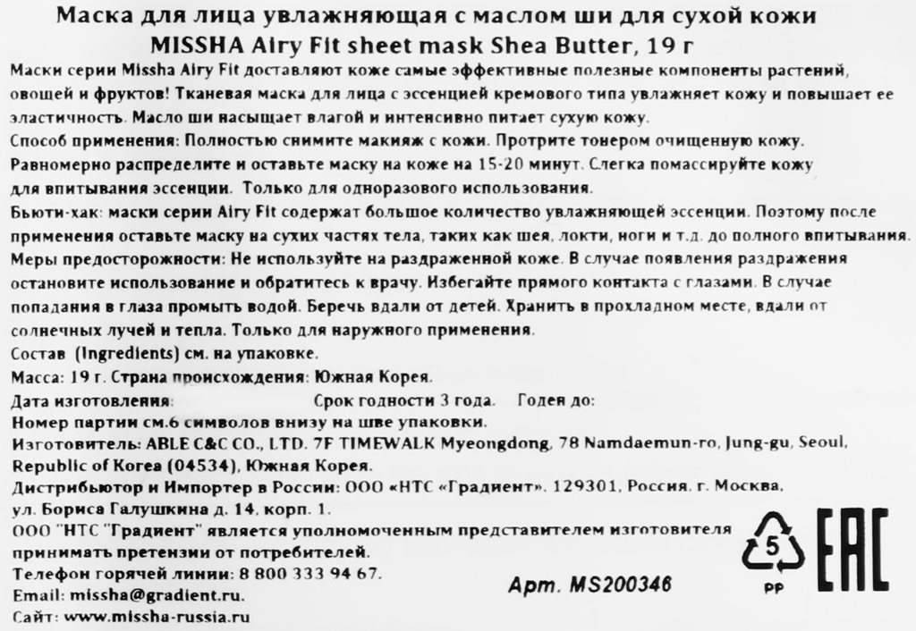 Маска для лица MISSHA Airy Fit Sheet Mask (Shea Butter) (8809581454798)