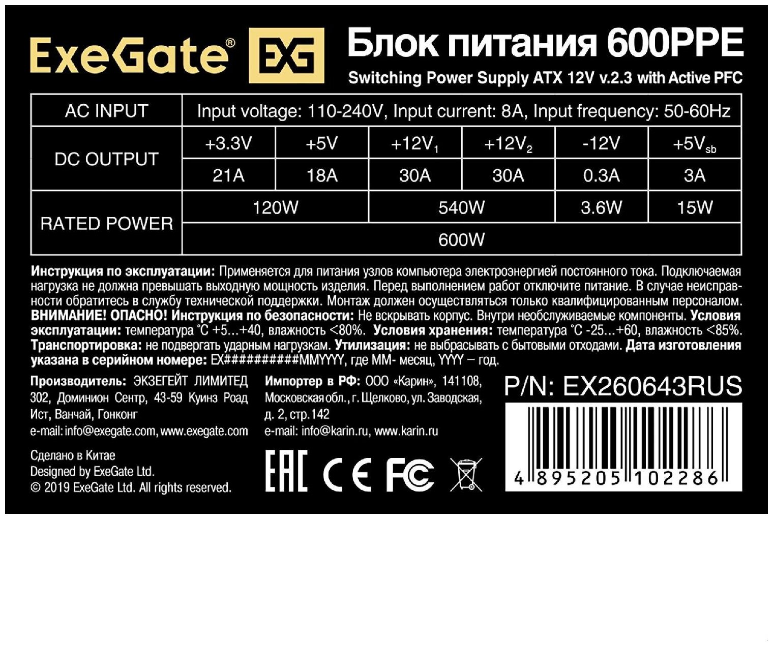 Блок питания ExeGate 600W ATX-600PPE (EX260643RUS-S) Black